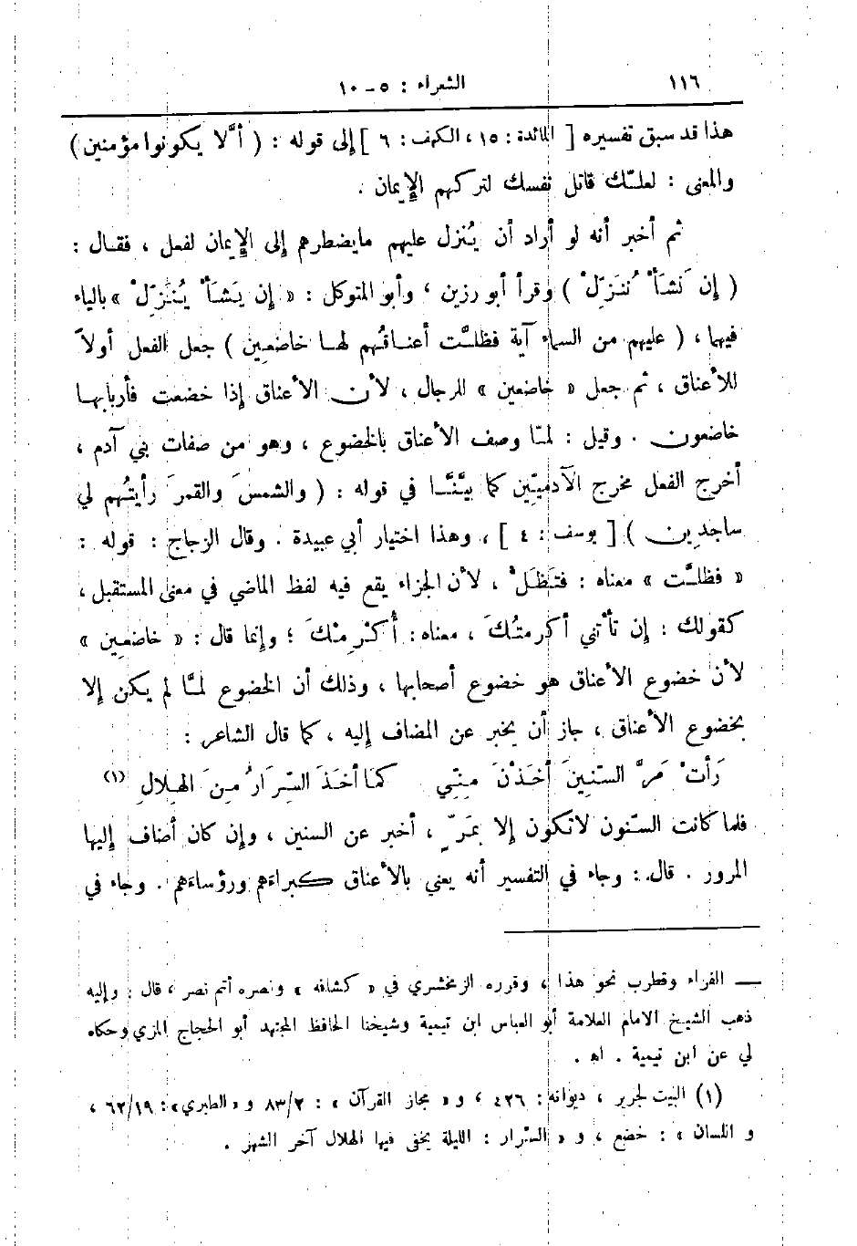 ثم أخبر أنه لو أراد أن ينزل عليهم ما يضطرهم إلى الإيمان لفعل فقال إن نشأ ننزل وقرأ أبو رزين وأبو المتوكل إن يشأ ينزل بالياء فيهما عليهم من السماء آية فظلت لها خاضعين جعل الفعل أولا للأعناق ثم جعل خاضعين للرجال لأن الأعناق إذا خضعت فأربابها خاضعون وقيل لما وصف الأعناق بالخضوع وهو من صفات بني آدم أخرج الفعل مخرج الآدميين كما بينا في قوله والشمس والقمر رأيتهم لي ساجدين يوسف وهذا اختيار أبي عبيدة وقال الزجاج قوله فظلت معناه فتظل لأن الجزاء يقع فيه لفظ الماضي في معنى المستقبل كقولك إن تأتني أكرمتك معناه أكرمك وإنما قال خاضعين لأن خضوع الأعناق هو خضوع أصحابها وذلك أن الخضوع لما لم يكن إلا بخضوع الأعناق جاز أن يخبر عن المضاف إليه كما قال الشاعر ... رأت مر السنين أخذن مني ... كما أخذ السرار من الهلال ...