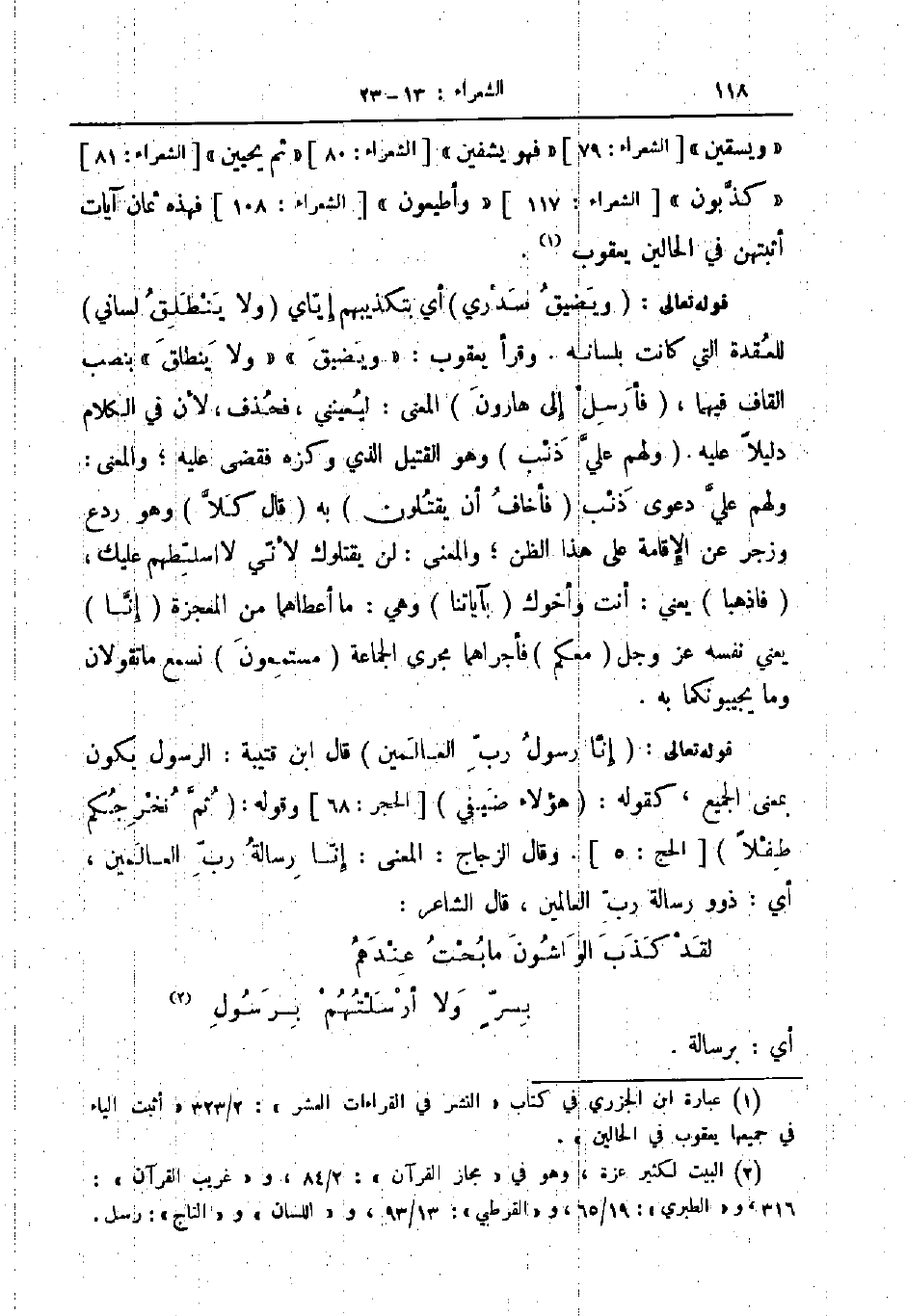 قوله تعالى ويضيق صدري أي بتكذيبهم إياي ولا ينطلق لساني للعقدة التي كانت بلسانه وقرأ يعقوب ويضيق ولا ينطلق بنصب القاف فيهما فأرسل إلى هارون المعنى ليعينني فحذف لأن في الكلام دليلا عليه ولهم علي ذنب وهو القتيل الذي وكزه فقضى عليه والمعنى ولهم علي دعوى ذنب فأخاف أن يقتلون به قال كلا وهو ردع وزجر عن الإقامة على هذا الظن والمعنى لن يقتلوك لأني لا اسلطهم عليك فاذهبا يعني أنت وأخوك بآياتنا وهي ما أعطاهما من المعجزة إنا يعني نفسه عز و جل معكم فأجراها مجرى الجماعة مستمعون نسمع ما تقولان وما يجيبونكما به