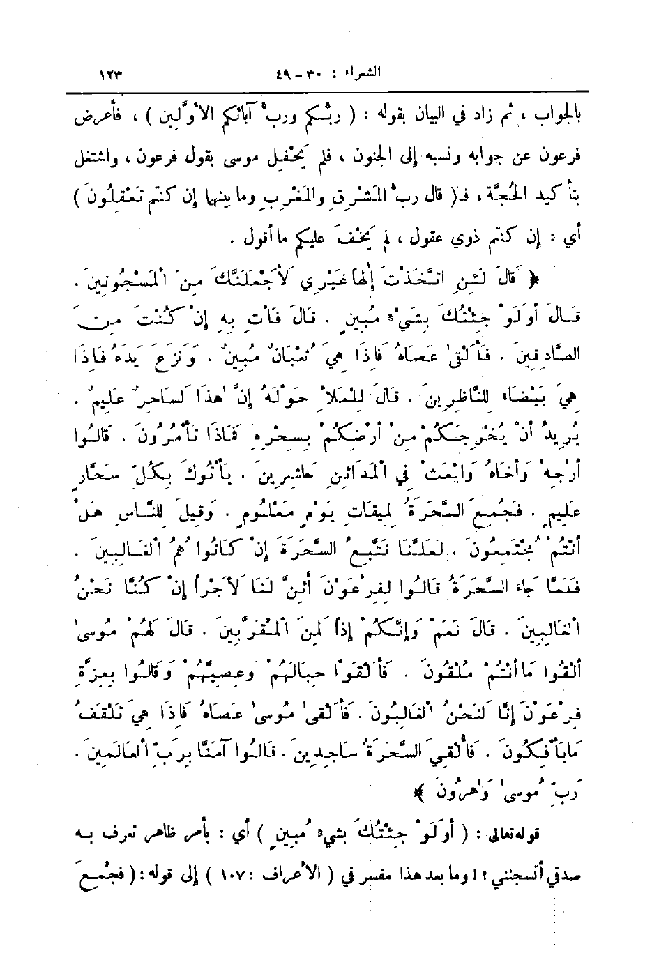 بالجواب ثم زاد في البيان بقوله ربكم ورب آبائكم الأولين فأعرض فرعون عن جوابه ونسبه إلى الجنون فلم يحفل موسى بقول فرعون واشتغل بتأكيد الحجة ف قال رب المشرق والمغرب وما بينهما إن كنتم تعقلون أي إن كنتم ذوي عقول لم يخف عليكم ما أقول قال لئن اتخذت إلها غيري لأجعلنك من المسجونين قال أو لو جئتك بشئ مبين قال فأت به إن كنت من الصادقين فألقى عصاه فاذا هي ثعبان مبين ونزع يده فاذا هي بيضاء للناظرين قال للملأ حوله إن هذا لساحر عليم يريد أن يخرجكم من أرضكم بسحره فماذا تأمرون قالوا أرجه وأخاه وابعث في المدائن حاشرين يأتوك بكل سحار عليم فجمع السحرة لميقات يوم معلوم وقيل للناس هل أنتم مجتمعون لعلنا نتبع السحرة إن كانوا هم الغالبين فلما جاء السحرة قالوا لفرعون أئن لنا لأجرا إن كنا نحن الغالبين قال نعم وإنكم إذا لمن المقربين قال لهم موسى ألقوا ما أنتم ملقون فألقوا حبالهم وعصيهم وقالوا بعزة فرعون إنا لنحن الغالبون فألقى موسى عصاه فاذا هي تلقف ما يأفكون فألقي السحرة ساجدين قالوا آمنا برب العالمين رب موسى وهارون