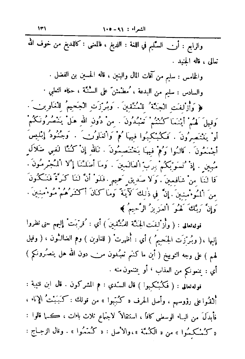والسادس سليم من البدعة مطمئن على السنة حكاه الثعلبي وأزلفت الجنة للمتقين وبرزت الجحيم للغاوين وقيل لهم أينما كنتم تعبدون من دون الله هل ينصرونكم أو ينتصرون فكبكبوا فيها هم والغاوون وجنود إبليس أجمعون قالوا وهم فيها يختصمون تالله إن كنا لفي ضلال مبين إذ نسويكم برب العالمين وما اضلنا إلا المجرمون فما لنا من شافعين ولا صديق حميم فلو أن لنا كرة فنكون من المؤمنين إن في ذلك لآية وما كان أكثرهم مؤمنين وإن ربك لهو العزيز الرحيم