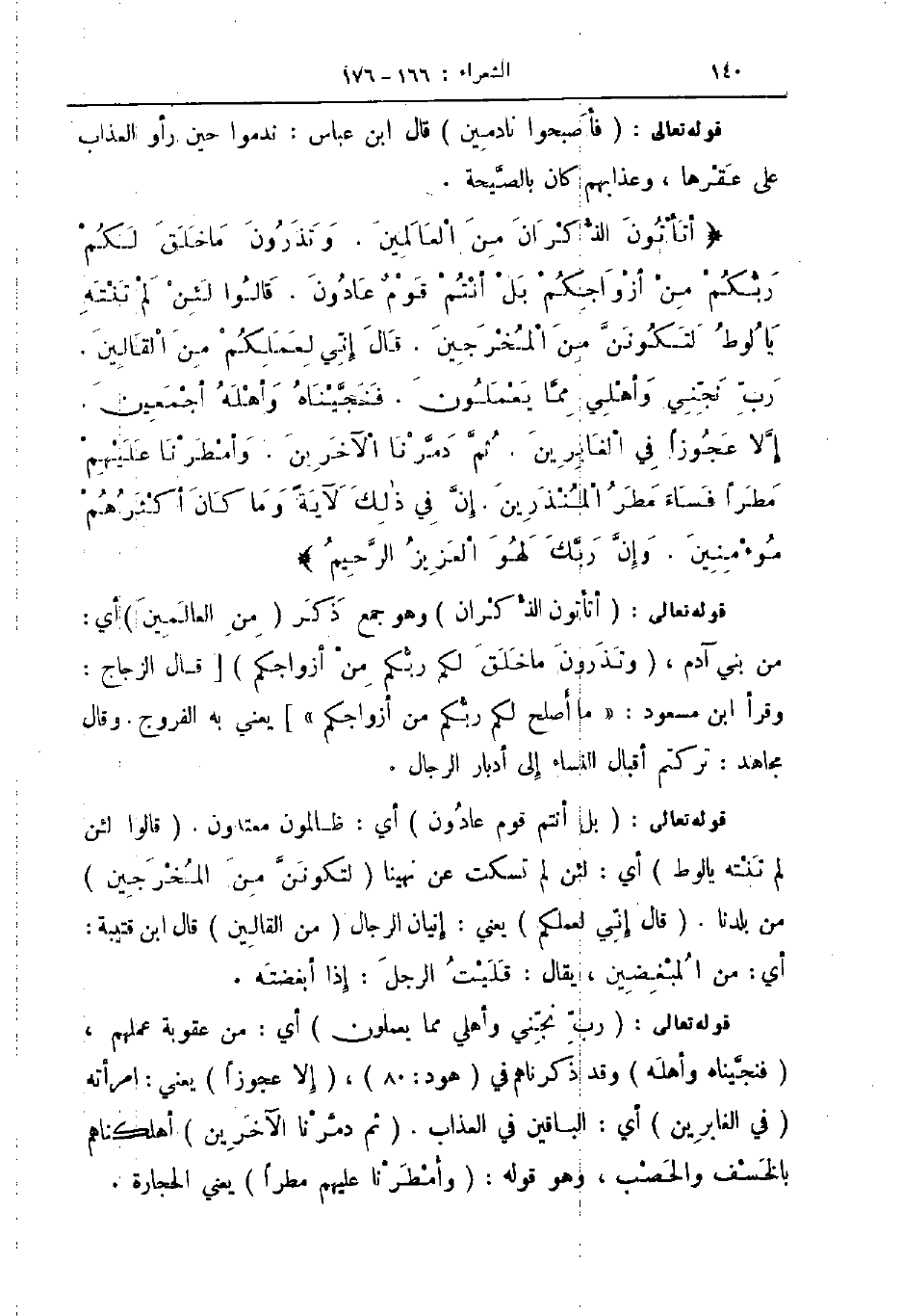 أتأتون الذكران من العالمين وتذرون ماخلق لكم ربكم من أزواجكم بل أنتم قوم عادون قالوا لئن لم تنته يا لوط لتكونن من المخرجين قال إني لعملكم من القالين رب نجني وأهلي مما يعملون فنجيناه وأهله أجمعين إلا عجوزا في الغابرين ثم دمرنا الآخرين وأمطرنا عليهم مطرا فساء مطر المنذرين إن في ذلك لآية وما كان أكثرهم مؤمنين وإن ربك لهو العزيز الرحيم