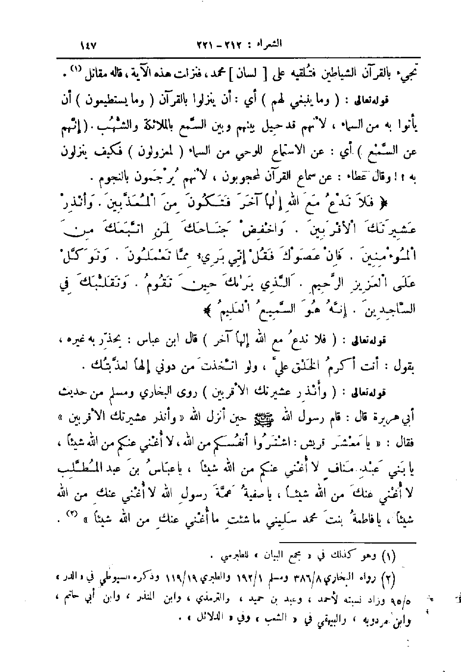 قوله تعالى وأنذر عشيرتك الأقربين روى البخاري ومسلم من حديث أبي هريرة قال قام رسول الله صلى الله عليه و سلم حين أنزل الله وأنذر عشيرتك الاقربين فقال يا معشر قريش اشتروا أنفسكم من الله لا أغني عنكم من الله شيئا يا بني عبد مناف لا أغني عنكم من الله شيئا يا عباس بن عبد المطلب لا أغني عنك من الله شيئا يا صفية عمة رسول الله لا أغني عنك من الله شيئا يا فاطمة بنت محمد سليني ما شئت ما أغني عنك من الله شيئا
