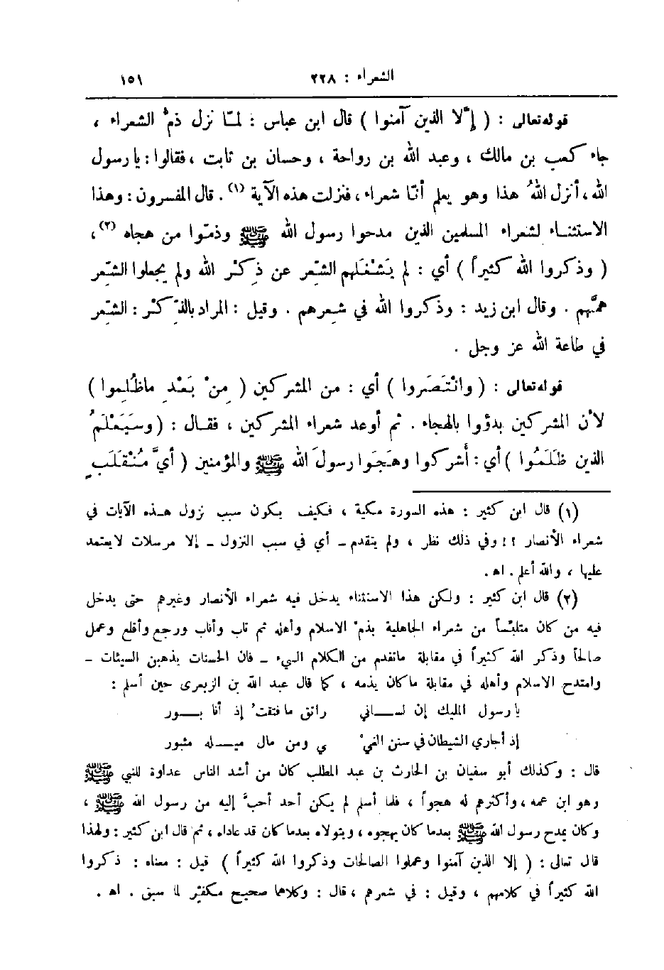قوله تعالى إلا الذين آمنوا قال ابن عباس لما نزل ذم الشعراء جاء كعب بن مالك وعبد الله بن رواحة وحسان بن ثابت فقالوا يا رسول الله أنزل الله هذا وهو يعلم أنا شعراء فنزلت هذه الآية قال المفسرون وهذا الاستثناء لشعراء المسلمين الذين مدحوا رسول الله صلى الله عليه و سلم وذموا من هجاء وذكروا الله كثيرا أي لم يشغلهم الشعر عن ذكر الله ولم يجعلوا الشعر همهم وقال ابن زيد وذكروا الله في شعرهم وقيل المراد بالذكر الشعر في طاعة الله عز و جل