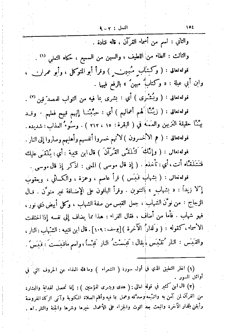 قال تعالى بشهاب قبس قرأ عاصم وحمزة والكسائي ويعقوب إلا زيدا بشهاب بالتنوين وقرأالباقون على الإضافة غير منون قال الزجاج من نون الشهاب وجعل القبس من صفة الشهاب وكل أبيض ذي نور فهو شهاب فأما من أضاف فقال الفراء هذا مما يضاف إلى نفسه إذا اختلفت الاسماء كقوله ولدار الآخرة يوسف 109 قال ابن قتيبة الشهاب النار والقبس النار تقبس يقال قبست النار قبسا واسم ماقبست قبس