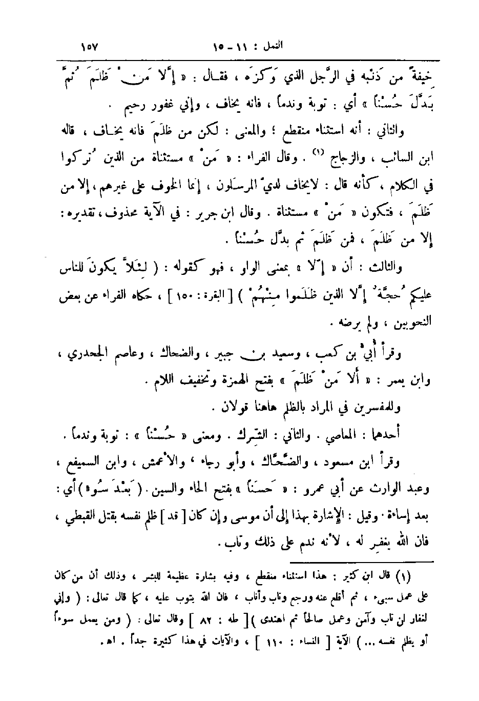 والثاني أنه استثناء منقطع والمعنى لكن من ظلم فانه يخاف قاله ابن السائب والزجاج وقال الفراء من مستثناه من الذين تركوا في الكلام كأنه قال لا يخاف لدي المرسلون إنما الخوف على غيرهم إلا من ظلم فتكون من مستثناة وقال ابن جرير في الآية محذوف تقديره إلا من ظلم فمن ظلم ثم بدل حسنا