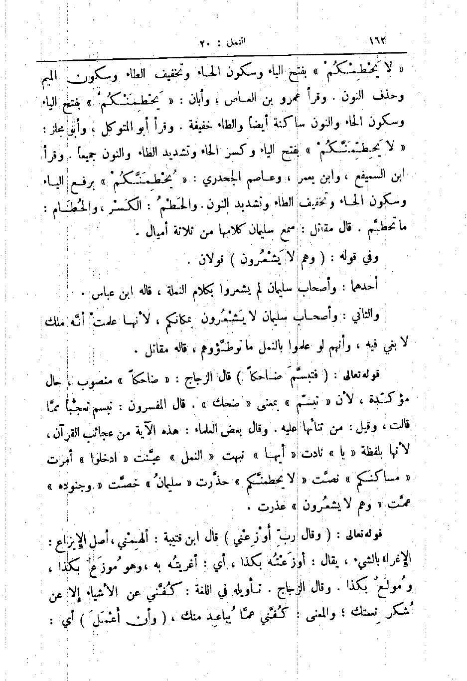 قوله تعالى فتبسم ضاحكا قال الزجاج ضاحكا منصوب حال مؤكدة لأن تبسم بمعنى ضحك قال المفسرون تبسم تعجبا مما قالت وقيل من ثنائها عليه وقال بعض العلماء هذه الآية من عجائب القرآن لأنها بلفظة يا نادت أيها نبهت النمل عينت ادخلوا أمرت مساكنكم نصت لا يحطمنكم حذرت سليمان خصت وجنوده عمت وهم لا يشعرون عذرت