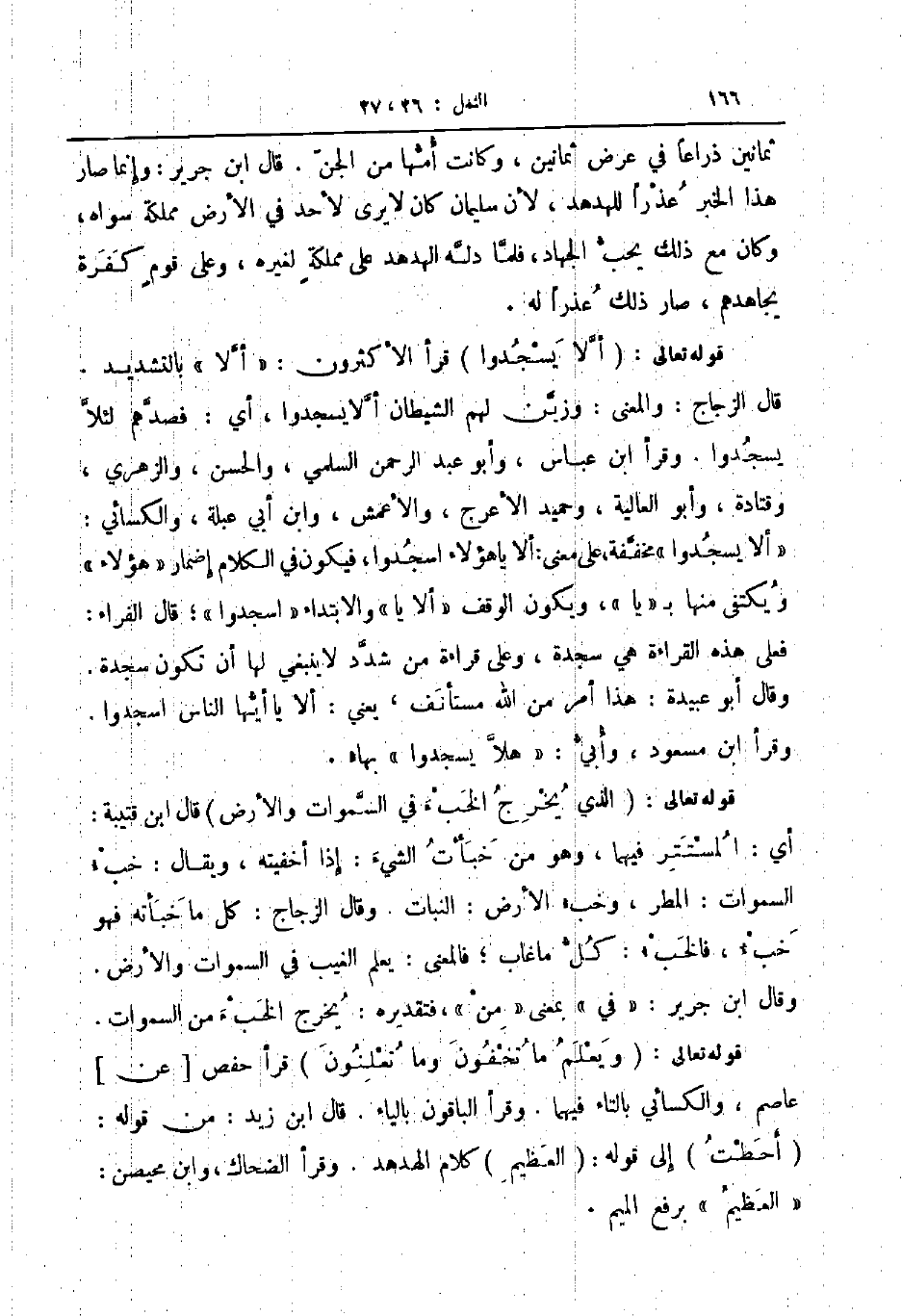 قوله تعالى ألا يسجدوا قرأ الأكثرون ألا بالتشديد قال الزجاج والمعنى وزين لهم الشيطان ألا يسجدوا أي فصدهم لئلا يسجدوا وقرأ ابن عباس وابو عبد الرحمن السلمي والحسن والزهري وقتادة وأبو العالية وحميد الأعرج والأعمش وابن أبي عبلة والكسائي ألا يسجدوا مخففة على معنى ألا يا هؤلاء اسجدوا فيكون في الكلام إضمار هؤلاء ويكتفى منها ب يا ويكون الوقف ألا يا والابتداء اسجدوا قال الفراء فعلى هذه القراءة هي سجدة وعلى قراءة من شدد لا ينبغي لها أن تكون سجدة وقال أبو عبيدة هذا أمر من الله مستأنف يعني ألا يا أيها الناس اسجدوا وقرأ ابن مسعود وأبي هلا يسجدوا بهاء