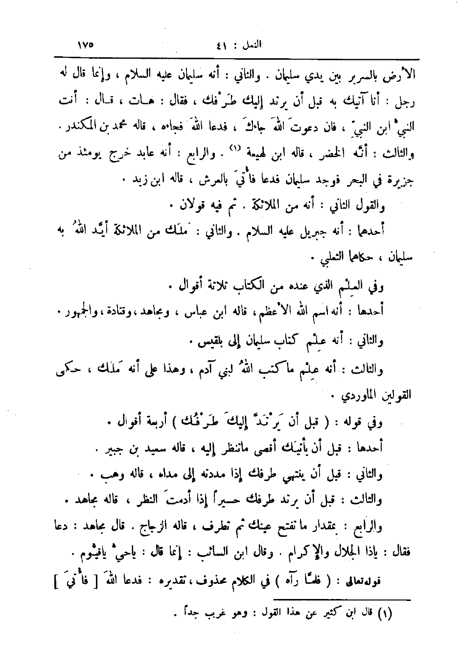 الأرض بالسرير بين يدي سليمان والثاني أنه سليمان عليه السلام وإنما قال له رجل انا آتيك به قبل أن يرتد إليك طرفك فقال هات قال انت النبي ابن النبي فان دعوت الله جاءك فدعا الله فجاءه قاله محمد بن المكندر والثالث أنه الخضر قاله ابن لهيعة والرابع انه عابد خرج يومئذ من جزيرة في البحر فوجد سليمان فدعا فأتي بالعرش قاله ابن زيد والقول الثاني أنه من الملائكة قولان