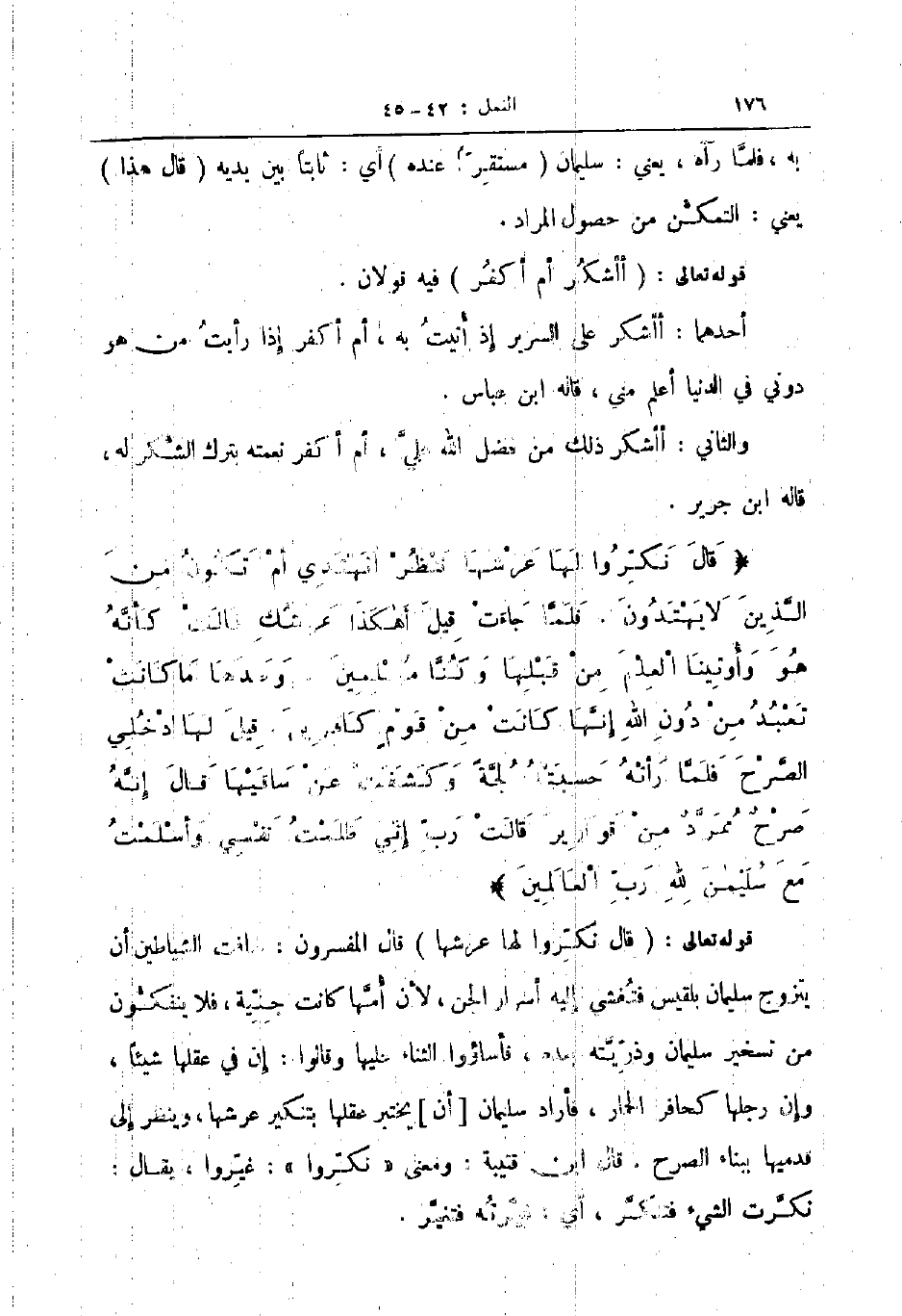 قال نكروا لها عرشها ننظر أتهتدي أم تكون من الذين لايهتدون فلما جاءت قيل أهكذا عرشك قالت كأنه هو وأتينا العلم من قبلها وكنا مسلمين وصدها ما كانت تعبد من دون الله إنها كانت من قوم كافرين قيل لها ادخلي الصرح فلما رأته حسبته لجة وكشفت عن ساقيها قال إنه صرح ممرد من قوارير قالت رب إني ظلمت نفسي وأسلمت مع سليمن لله رب العالمين