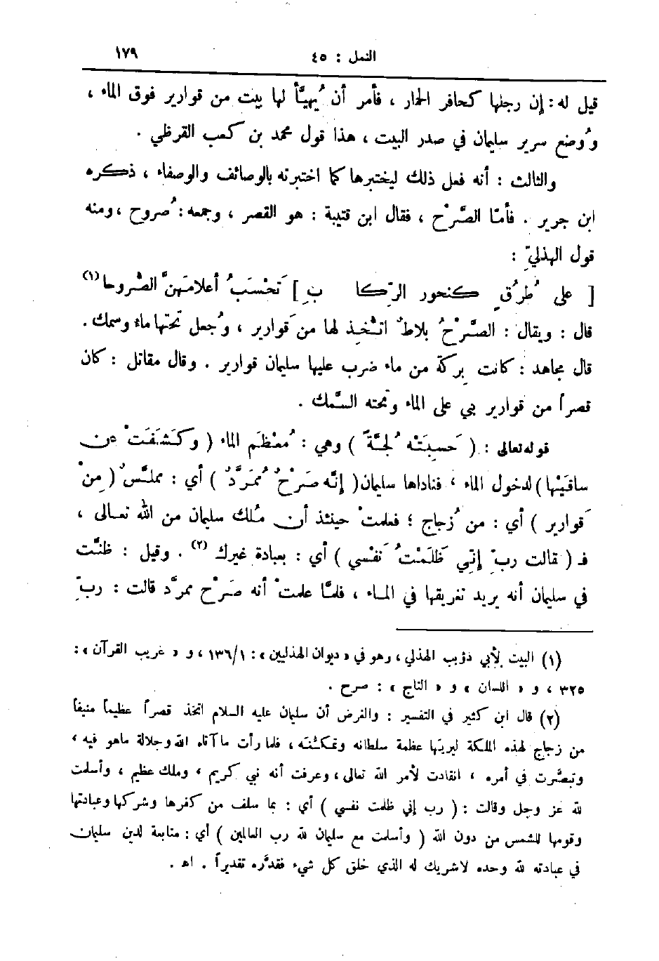 قيل له إن رجلها كحافر الحمار فامر ان يهيأ لها بيت من قوارير فوق الماء ووضع سرير سليمان في صدر البيت هذا قول محمد بن كعب القرظي