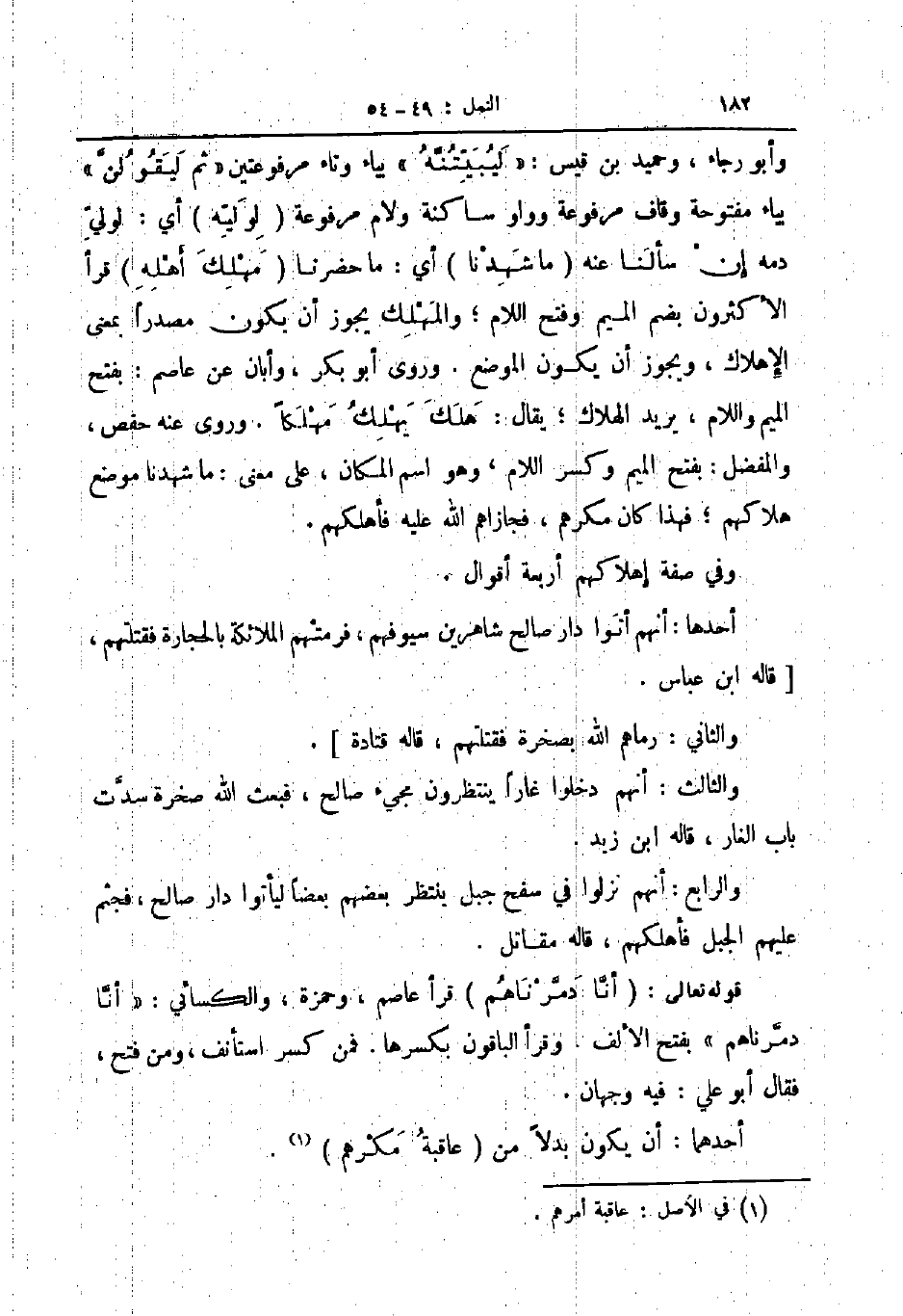 وأبو رجاء وحميد بن قيس ليبيتنه بياء وتاء مرفوعتين ثم ليقولن بياء مفتوحة وقاف مرفوعة وواو ساكنة ولام مرفوعة لوليه أي لولي دمه إن سألنا عنه ما شهدنا أي ما حضرنا مهلك أهله قرأ الاكثرون بضم الميم وفتح اللام والمهلك يجوز أن يكون مصدرا بمعنى الإهلاك ويجوز ان يكون الموضع وروى ابو بكر وأبان عن عاصم بفتح الميم واللام يريد الهلاك يقال هلك يهلك مهلكا وروى عنه حفص والمفضل بفتح الميم وكسر اللام وهو اسم المكان على معنى ما شهدنا موضع هلاكهم فهذا كان مكرهم فجازاهم الله عليه فأهلكهم