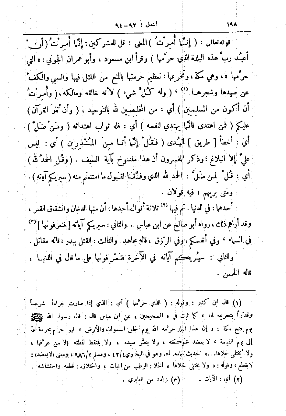 قوله تعالى إنما أمرت المعنى قل للمشركين إنما أمرت أن أعبد رب هذه البلدة الذي حرمها وقرأ ابن مسعود وأبو عمران الجوني التي حرمها وهي مكة وتحريمها تعظيم حرمتها بالمنع من القتل فيها والسبي والكف عن صيدها وشجرها وله كل شئ لأنه خالقه ومالكه وأمرت أن أكون من المسلمين أي من المخلصين لله بالتوحيد وأن أتلو القرآن عليكم فمن اهتدى فانما يهتدي لنفسه أي فله ثواب اهتدائه ومن ضل أي أخطأ طريق الهدى فقل إنما أنا من المنذرين أي ليس علي إلا البلاغ وذكر المفسرون أن هذا منسوخ بآية السيف وقل الحمد لله أي قل لمن ضل الحمد لله الذي وفقنا لقبول ما امتنعتم منه سيريكم آياته