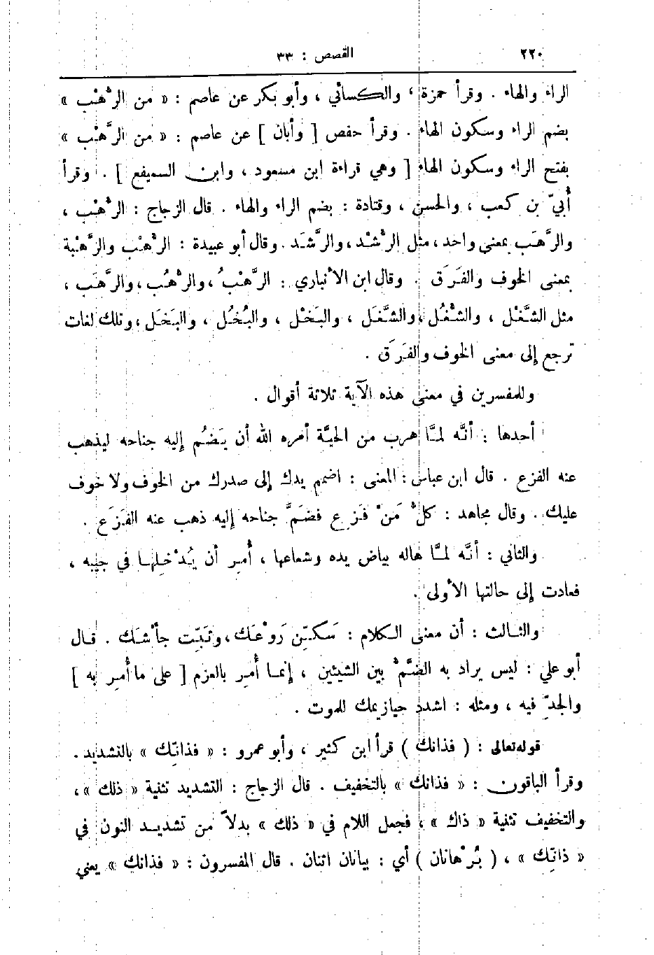 قوله تعالى فذانك قرأ ابن كثير وأبو عمرو فذانك بالتشديد وقرأ الباقون فذانك بالتخفيف قال الزجاج التشديد تثنية ذلك والتخفيف تثنية ذاك فجعل اللام في ذلك بدلا من تشديد النون في ذانك برهانان أي بيانان اثنان قال المفسرون فذانك يعني
