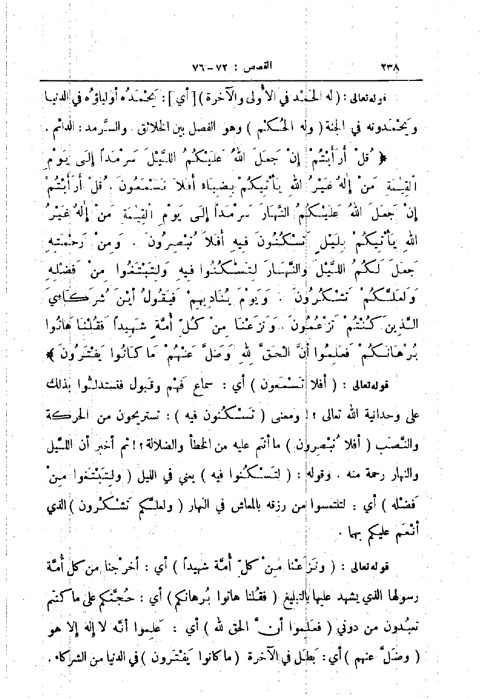 قوله تعالى له الحمد في الأولى والآخرة أي يحمده أولياؤه في الدنيا ويحمدونه في الجنة وله الحكم وهو الفصل بين الخلائق والسرمد الدائم قل أرأيتم إن جعل الله عليكم الليل سرمدا إلى يوم القيامة من إله غير الله يأتيكم بضياء أفلا تسمعون قل أرأيتم إن جعل الله عليكم النهار سرمدا إلى يوم القيامة من إله غير الله يأتيكم بليل تسكنون فيه افلا تبصرون ومن رحمته جعل لكم الليل والنهار لتسكنوا فيه ولتبتغوا من فضله ولعلكم تشكرون ويوم يناديهم فيقول أين شركاءي الذين كنتم تزعمون ونزعنا من كل أمة شهيدا فقلنا هاتوا برهانكم فعلموا أن الحق لله وضل عنهم ما كانوا يفترون