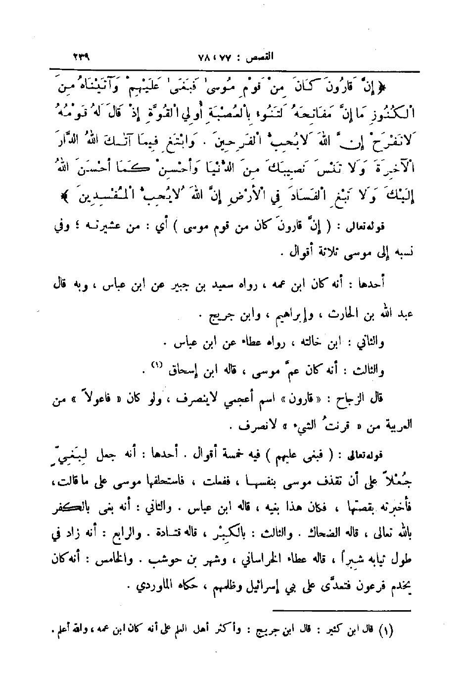 قوله تعالى إن قارون كان من قوم موسى أي من عشيرته وفي نسبه إلى موسى ثلاثة أقوال