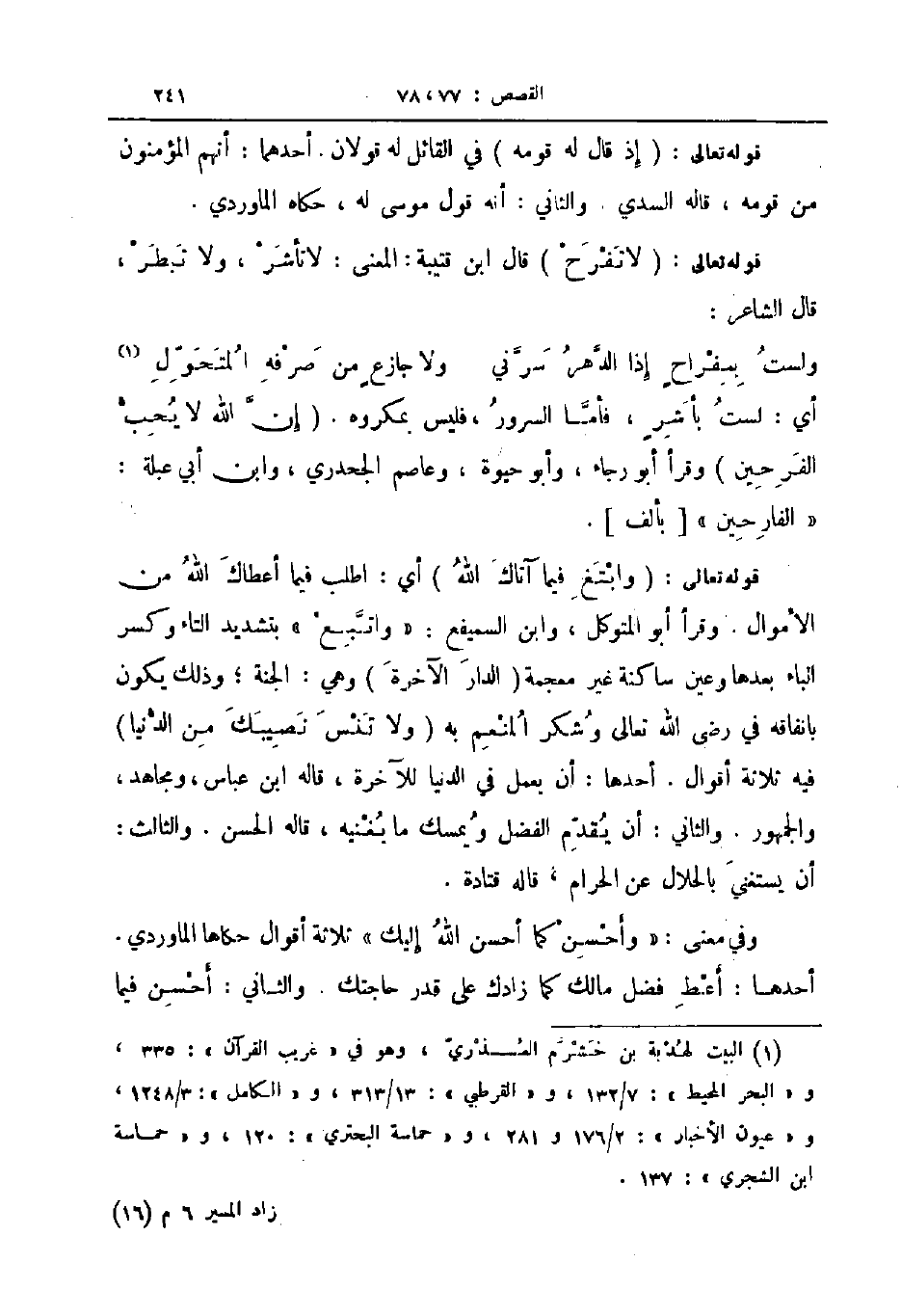 قوله تعالى لا تفرح قال ابن قتيبة المعنى لا تأشر ولا تبطر قال الشاعر ... ولست بمفراح إذا الدهر سرني ... ولا جازع من صرفه المتحول ...
