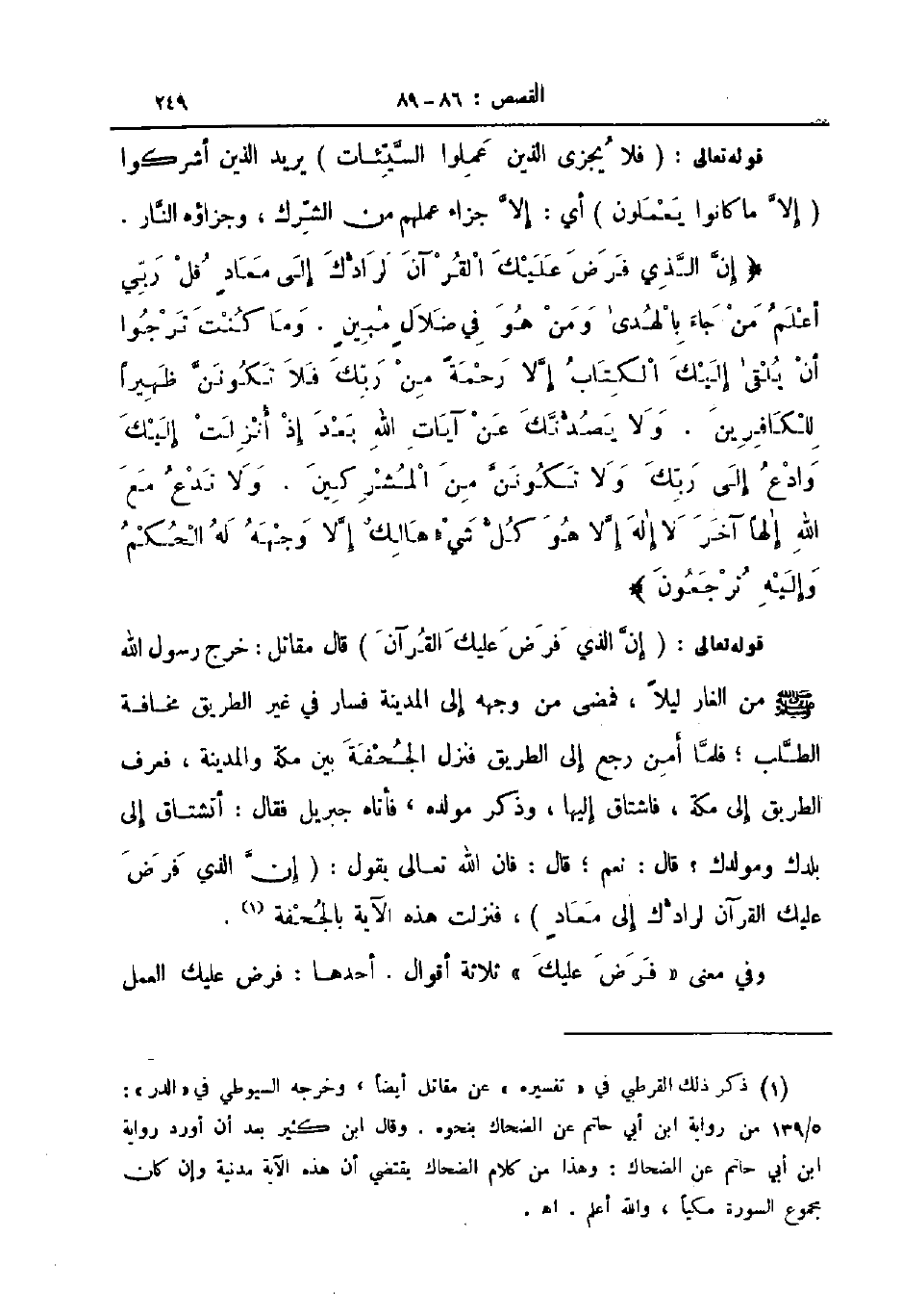إن الذي فرض عليك القرآن لرادك إلى معاد قل ربي أعلم من جاء بالهدى ومن هو في ضلال مبين وما كنت ترجوا أن يلقى إليك الكتاب إلا رحمة من ربك فلا تكونن ظهيرا للكافرين ولا يصدنك عن آيات الله بعد إذ أنزلت إليك وادع إلى ربك ولاتكونن من المشركين ولاتدع مع الله إلها آخر لا إله إلا هو كل شئ هالك إلا وجهه له الحكم وإليه ترجعون