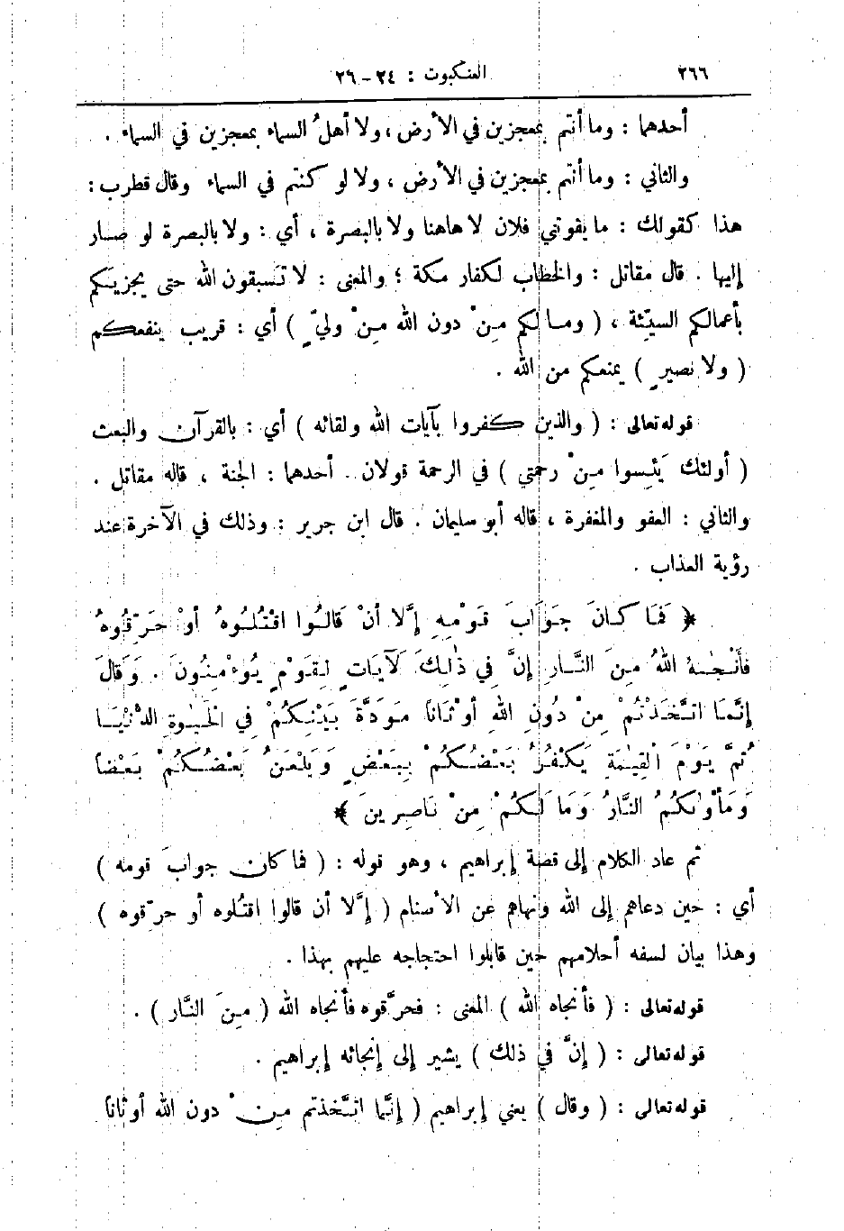 قوله تعالى والذين كفروا بآيات الله ولقائه أي بالقرآن والبعث أولئك يئسوا من رحمتي في الرحمة قولان أحدهما الجنة قاله مقاتل والثاني العفو والمغفرة قاله أبو سليمان قال ابن جرير وذلك في الآخرة عند رؤية العذاب فما كان جواب قومه إلا ان قالوا اقتلوه أو حرقوه فأنجاه الله من النار إن في ذلك لآيات لقوم يؤمنون وقال إنما اتخذتم من دون الله أوثانا مودة بينكم في الحياة الدنيا ثم يوم القيامة يكفر بعضكم ببعض ويلعن بعضكم بعضا ومأواكم النار وما لكم من ناصرين