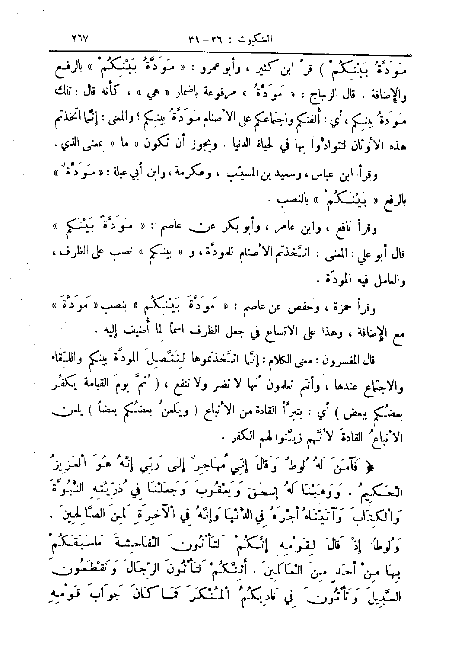 قال المفسرون معنى الكلام إنما اتخذتموها لتتصل المودة بينكم واللقاء والاجتماع عندها وأنتم تعلمون أنها لا تضر ولا تنفع ثم يوم القيامة يكفر بعضكم ببعض أي يتبرأ القادة من الأتباع ويلعن بعضكم بعضا يلعن الأتباع القادة لانهم زينوا لهم الكفر فآمن له لوط وقال إني مهاجر إلى ربي إنه هو العزيز الحكيم ووهبنا له إسحاق ويعقوب وجعلنا في ذريته النبوة والكتاب وآتيناه أجره في الدنيا وإنه في الآخرة لمن الصالحين ولوطا إذ قال لقومه إنكم لتأتون الفاحشة ما سبقكم بها من أحد من العالمين أئنكم لتأتون الرجال وتقطعون السبيل وتأتون في ناديكم المنكر فما كان جواب قومه