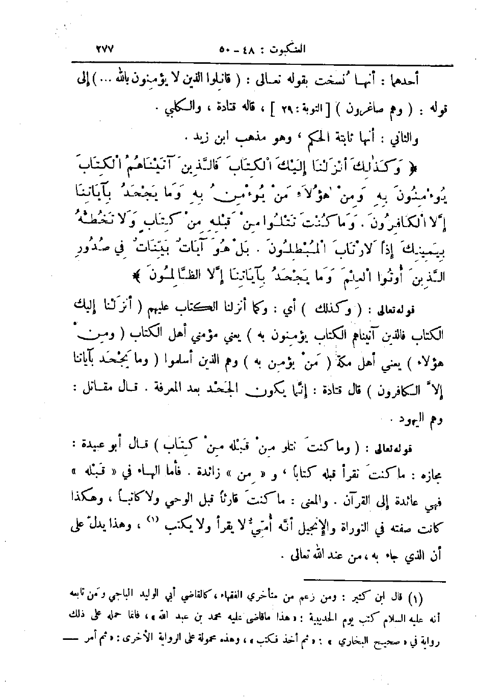 والثاني أنها ثابتة الحكم وهو مذهب ابن زيد وكذلك أنزلنا إليك الكتاب فالذين آتيناهم الكتاب يؤمنون به ومن هؤلاء من يؤمن به وما يجحد بآياتنا إلا الكافرون وما كنت تتلوا من قبله من كتاب ولا تخطه بيمينك إذا لارتاب المبطلون بل هو آيات بينات في صدور الذين أوتوا العلم وما يجحد بآياتنا إلا الظالمون
