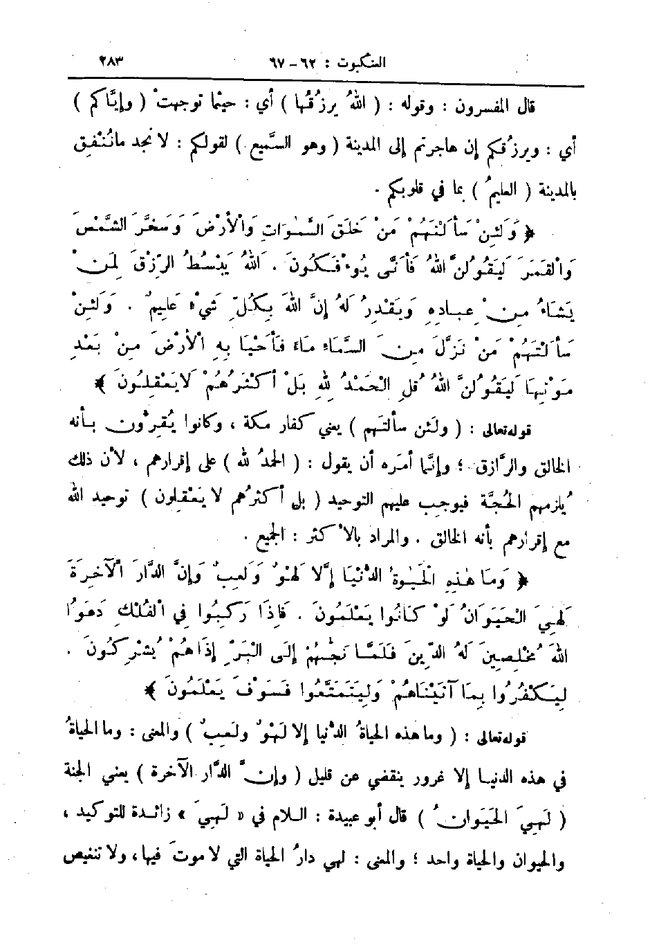 قوله تعالى ولئن سألتهم يعني كفار مكة وكانوا يقرون بأنه الخالق والرازق وإنما أمره أن يقول الحمد لله على إقرارهم لأن ذلك يلزمهم الحجة فيوجب عليهم بل أكثرهم لا يعقلون توحيد الله مع إقرارهم بأنه الخالق والمراد بالأكثر الجميع وما هذه الحياة الدنيا إلا لهو ولعب وإن الدار الآخرة لهي الحيوان لو كانوا يعلمون فاذا ركبوا في الفلك دعوا الله مخلصين له الدين فلما نجاهم إلى البر إذا هم يشركون ليكفروا بما آتيناهم وليتمتعوا فسوف يعلمون