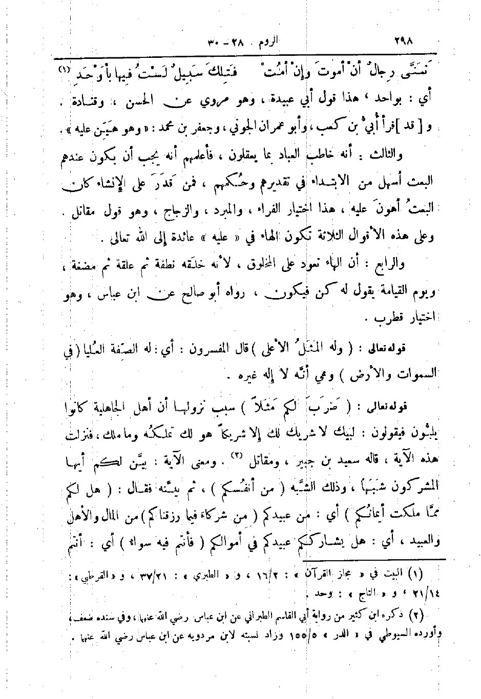 قوله تعالى ضرب لكم مثلا سبب نزولها أن اهل الجاهلية كانوا يلبون فيقولون لبيك لا شريك لك إلا شريكا هو لك تملكه وما ملك فنزلت هذه الآية قاله سعيد بن جبير ومقاتل ومعنى الآية بين لكم أيها المشركون شبها وذلك الشبه من أنفسكم ثم بينه فقال هل لكم مما ملكت أيمانكم أي من عبيدكم من شركاء فيما رزقناكم من المال والأهل والعبيد أي هل يشارككم عبيدكم في أموالكم فأنتم فيه سواء أي أنتم