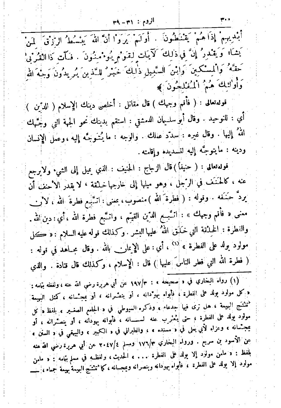 قوله تعالى حنيفا قال الزجاج الحنيف الذي يميل إلى الشيء ولا يرجع عنه كالحنف في الرجل وهو ميلها إلى خارجها خلقة لا يقدر الأحنف أن يرد حنفه وقوله فطرة الله منصوب بمعنى اتبع فطرة الله لأن معنى فأقم وجهك اتبع الدين القيم واتبع فطرة الله أي دين الله والفطرة الخلقة التي خلق الله عليها البشر وكذلك قوله عليه السلام كل مولود يولد على الفطرة أي على الإيمان بالله وقال مجاهد في قوله فطرة الله التي فطر الناس عليها قال الإسلام وكذلك قال قتادة والذي