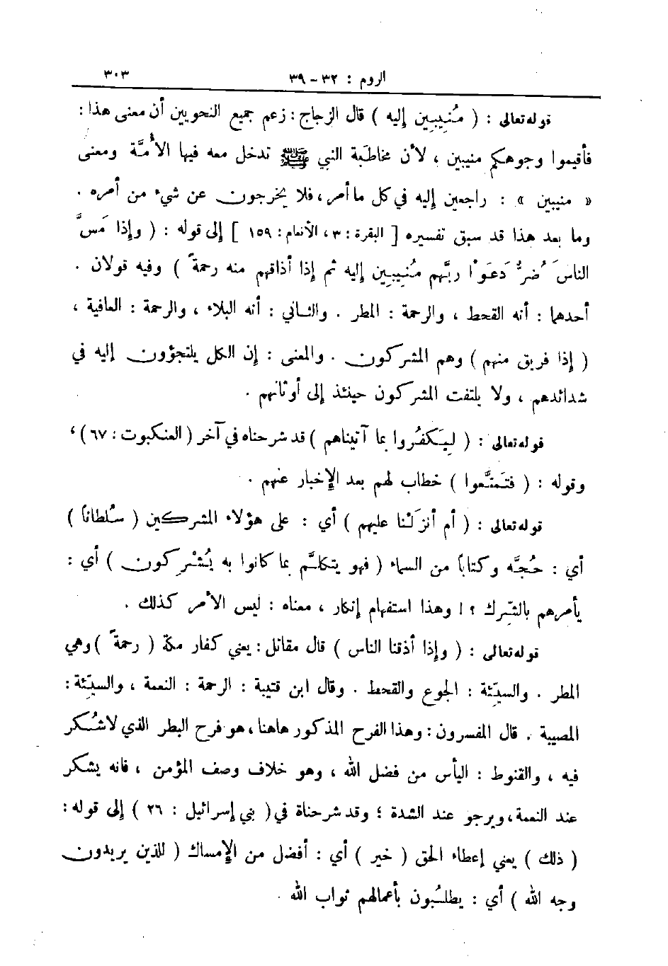 قوله تعالى منيبين إليه قال الزجاج زعم جميع النحويين أن معنى هذا فأقيموا وجوهكم منيبين لأن مخاطبة النبي ص تدخل معه فيها الأمة ومعنى منيبين راجعين إليه في كل ما أمر فلا يخرجون عن شئ من امره وما بعد هذا قد سبق تفسيره البقرة الأنعام إلى قوله وإذا مس الناس ضر دعوا ربهم منيبين إليه ثم إذا أذاقهم منه رحمة وفيه قولان أحدهما أنه القحط والرحمة المطر والثاني أنه البلاء والرحمة العافية إذا فريق منهم وهم المشركون والمعنى إن الكل يلتجؤون إليه في شدائدهم ولا يلتفت المشركون حينئذ إلى أوثانهم