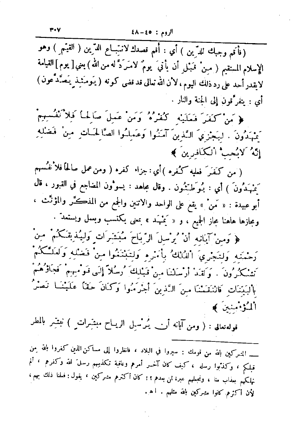 من كفر فعليه كفره أي جزاء كفره ومن عمل صالحا فلأنفسهم يمهدون أي يوطئون وقال مجاهد يسوون المضاجع في القبور قال أبو عبيدة من يقع على الواحد والاثنين والجمع من المذكر والمؤنث ومجازها هاهنا مجاز الجميع ويمهد بمعنى يكتسب ويعمل ويستعد ومن آياته أن يرسل الرياح مبشرات وليذيقكم من رحمته ولتجري الفلك بأمره ولتبتغوا من فضله ولعلكم تشكرون ولقد أرسلنا من قبلك رسلا إلى قومهم فجاؤهم بالبينات فانتقمنا من الذين أجرموا وكان حقا علينا نصر المؤمنين