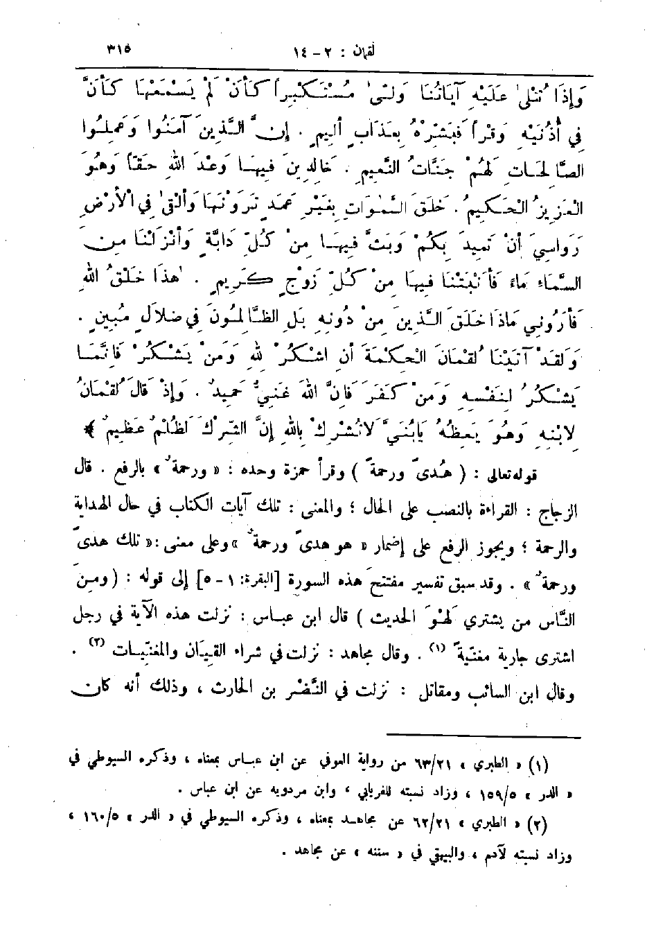 قوله تعالى هدى ورحمة وقرأ حمزة وحده ورحمة بالرفع قال الزجاج القراءة بالنصب على الحال والمعنى تلك آيات الكتاب في حال الهداية والرحمة ويجوز الرفع على إضمار هو هدى ورحمة وعلى معنى تلك هدى ورحمة وقد سبق تفسير مفتتح هذه السورة البقرة إلى قوله ومن الناس من يشتري لهو الحديث قال ابن عباس نزلت هذه الآية في رجل اشترى جارية مغنية وقال مجاهد نزلت في شراء القيان والمغنيات وقال ابن السائب ومقاتل نزلت في النضر بن الحارث وذلك أنه كان
