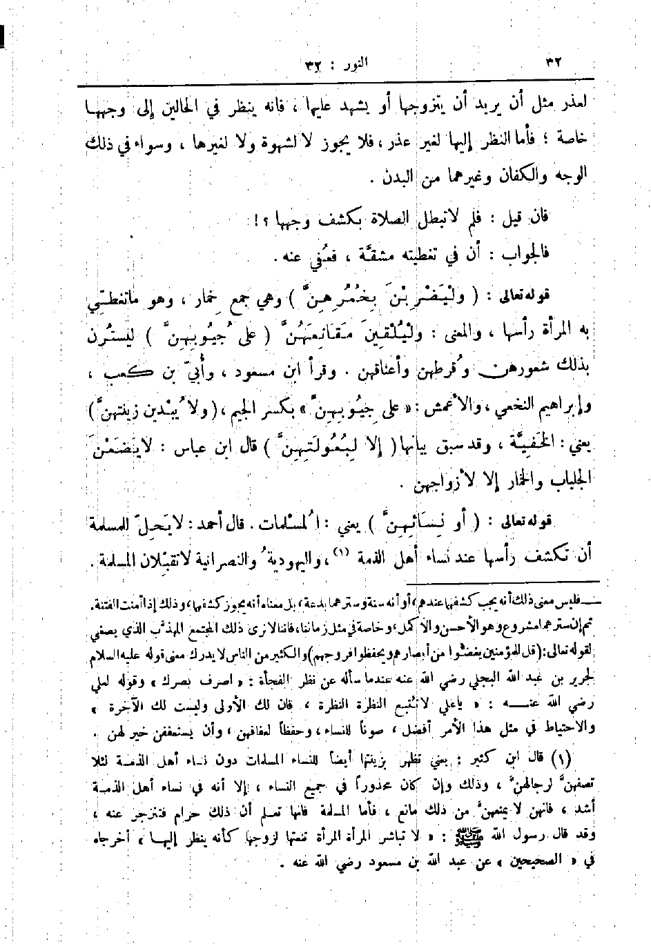 قوله تعالى وليضربن بخمرهن وهي جمع خمار وهو ما تغطى به المرأة رأسها والمعنى وليلقين مقانعهن على جيوبهن ليسترن بذلك شعورهن وقرطهن وأعناقهن وقرأ ابن مسعود وأبي بن كعب وإبراهيم النخفي والأعمش على جيوبهن بكسر الجيم ولا يبدين زينتهن يعني الخفية وقد سبق بيانها إلا لبعولتهن قال ابن عباس لا يضعن الجلباب والخمار إلا لأزواجهن