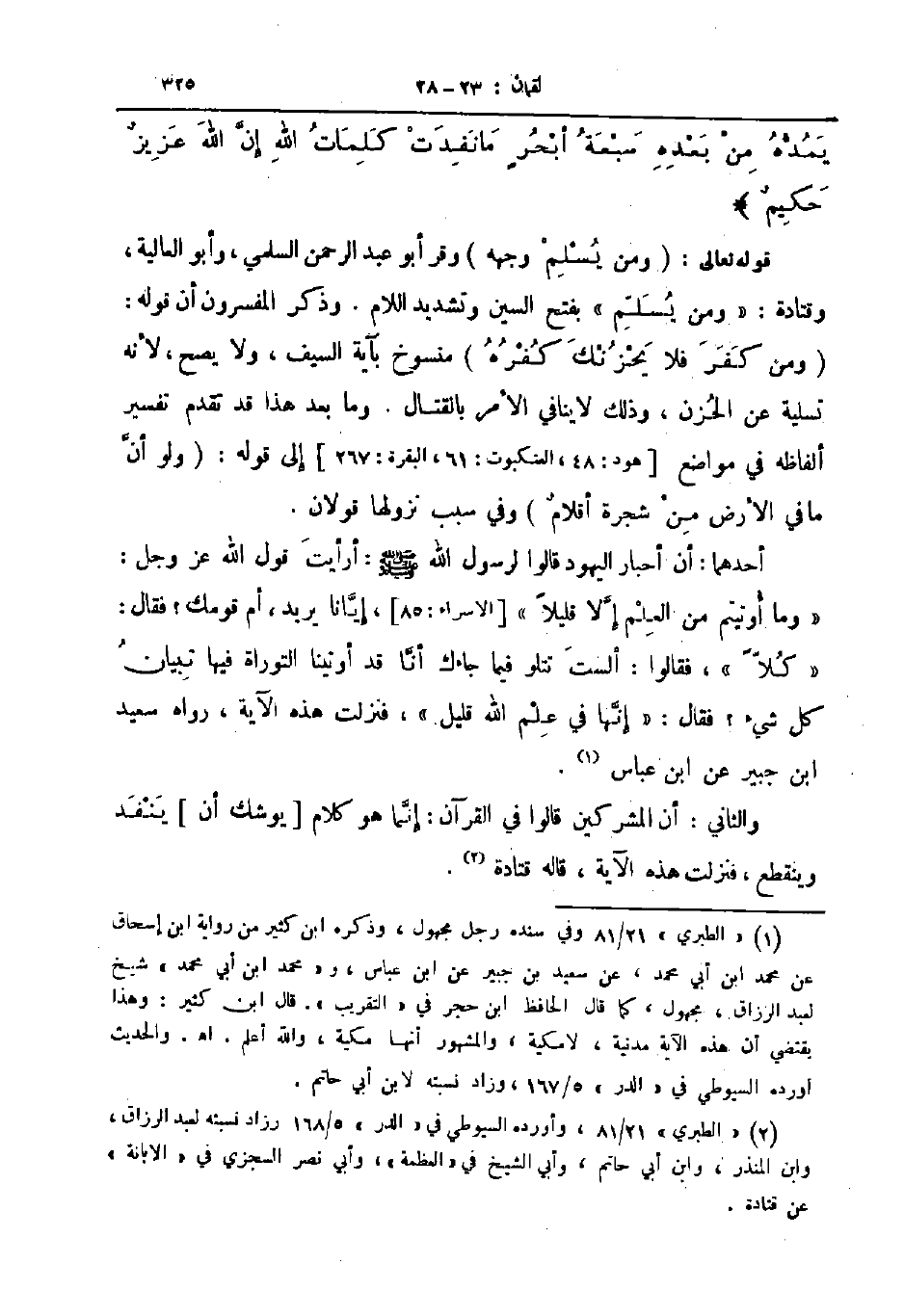 يمده من بعده سبعة أبحر ما نفدت كلمات الله إن الله عزيز حكيم قوله تعالى ومن يسلم وجهه وقرأ أبو عبد الرحمن السلمي وأبو العالية وقتادة ومن يسلم بفتح السين وتشديد اللام وذكر المفسرون أن قوله ومن كفر فلا يحزنك كفره منسوخ بآية السيف ولا يصح لانه تسلية عن الحزن وذلك لا ينافي الأمر بالقتال وما بعد هذا قد تقدم تفسير ألفاظه في مواضع هود 48 , العنكبوت61 , البقرة267 إلى قوله ولو أن ما في الأرض من شجرة أقلام وفي سبب نزولها قولان