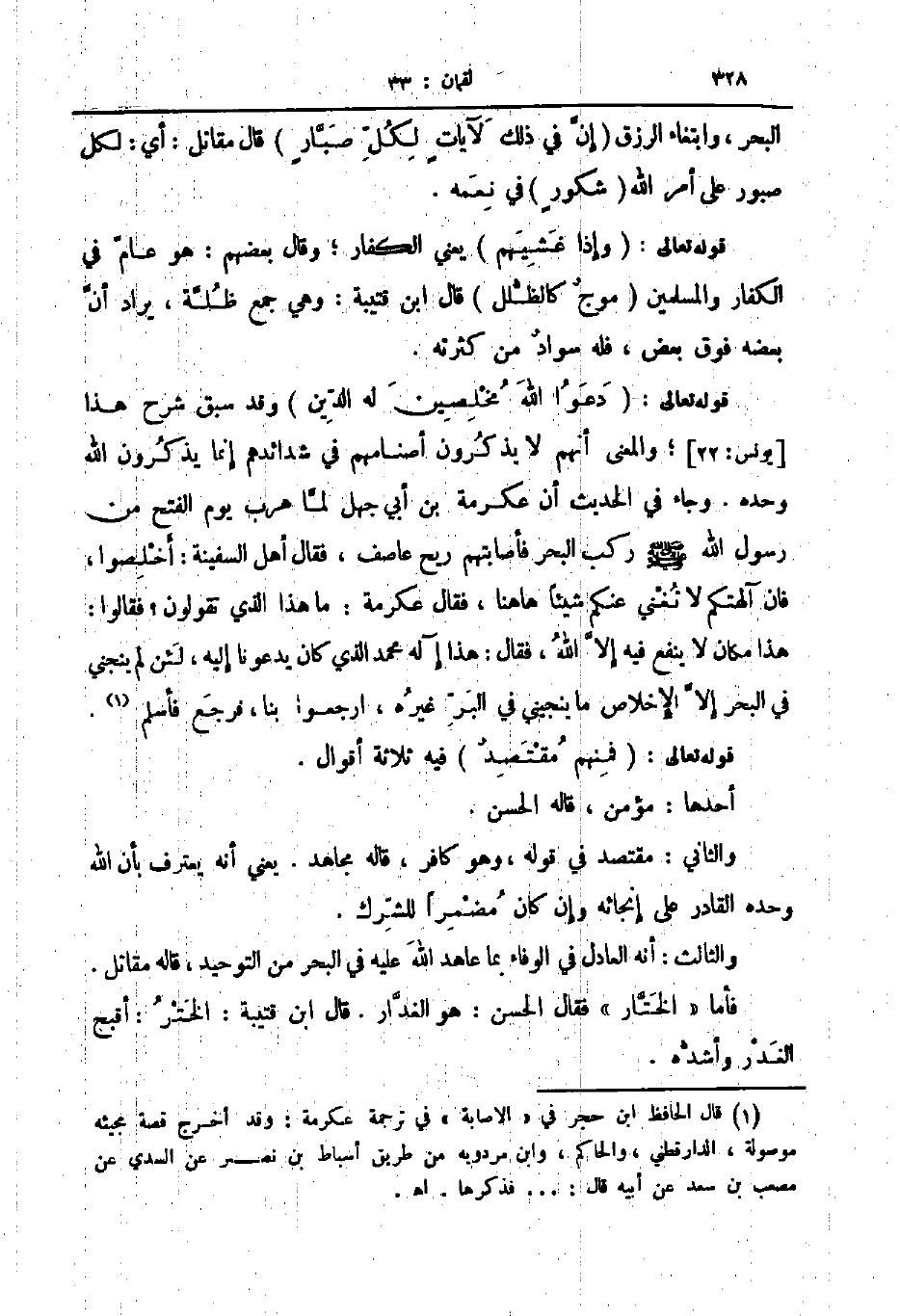 والثاني مقتصد في قوله وهو كافر قاله مجاهد يعني أنه يعترف بأن الله وحده القادر على إنجائه وإن كان مضمرا للشرك