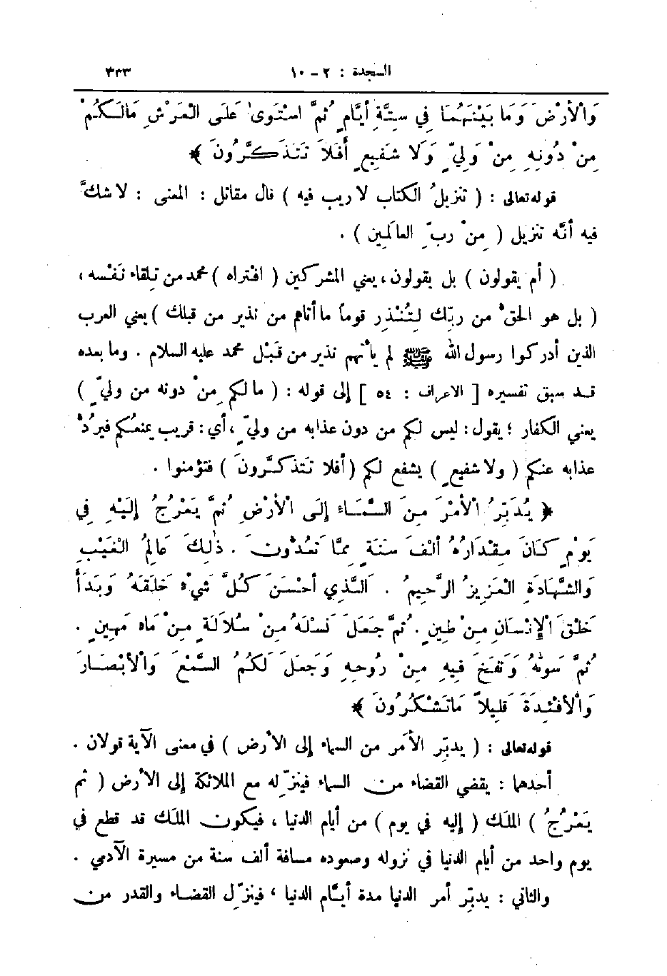 أم يقولون بل يقولون يعني المشركين افتراه محمد من تلقاء نفسه بل هو الحق من ربك لتنذر قوما ما اتاهم من نذير من قبلك يعني العرب الذين أدركوا رسول الله ص لم يأتهم نذير من قبل محمد عليه السلام وما بعده قد سبق تفسيره الاعراف إلى قوله ما لكم من دونه من ولي يعني الكفار يقول ليس لكم من دونه عذابه من ولي أي قريب يمنعكم فيرد عذابه عنكم ولا شفيع يشفع لكم أفلا تتذكرون فتؤمنوا يدبر الأمر من السماء إلى الأرض ثم يعرج إليه في يوم كان مقداره ألف سنة مما تعدون ذلك عالم الغيب والشهادة العزيز الرحيم الذي أحسن كل شئ خلقه وبدأ خلق الإنسان من طين ثم جعل نسله من سلالة من ماء مهين ثم سواه ونفخ فيه من روحه وجعل لكم السمع والأبصار والأفئدة قليلا ما تشكرون