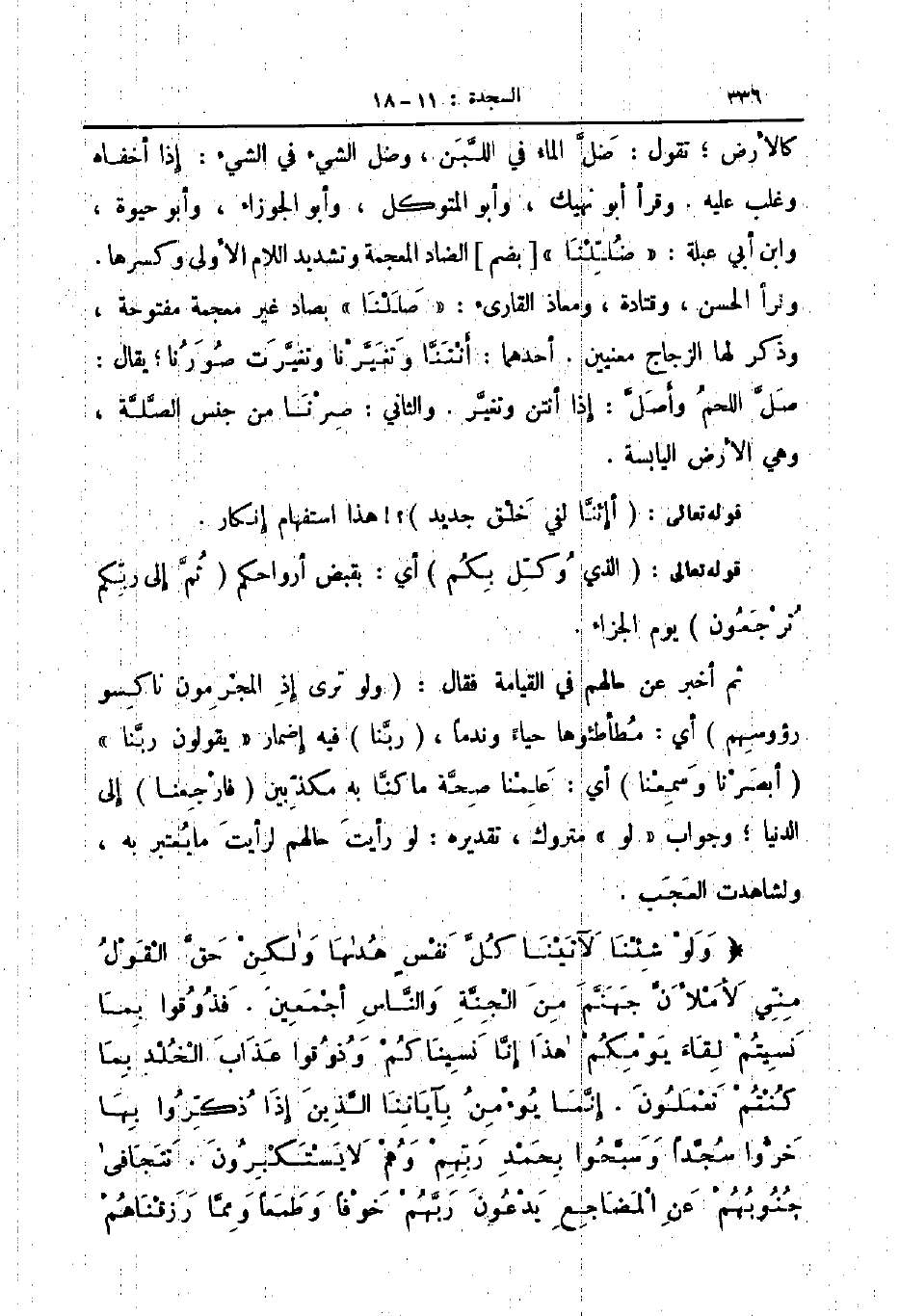 ثم اخبر عن حالهم في القيامة فقال ولو ترى إذ المجرمون ناكسو رؤوسهم أي مطأطئوها حياء وندما ربنا فيه إضمار يقولون ربنا أبصرنا وسمعنا أي علمنا صحة ما كنا به مكذبين فارجعنا إلى الدنيا وجواب لو متروك تقديره لو رأيت حالهم لرأيت ما يعتبر به ولشاهدت العجب ولو شئنا لآتينا كل نفس هداها ولكن حق القول مني لأملأن جهنم من الجنة والناس أجمعين فذوقوا بما نسيتم لقاء يومكم هذا إنا نسيناكم وذوقوا عذاب الخلد بما كنتم تعملون إنما يؤمن بآياتنا الذين إذا ذكروا بها خروا سجدا وسبحوا بحمد ربهم وهم لا يستكبرون تتجافى جنوبهم عن المضاجع يدعون ربهم خوفا وطمعا ومما رزقناهم