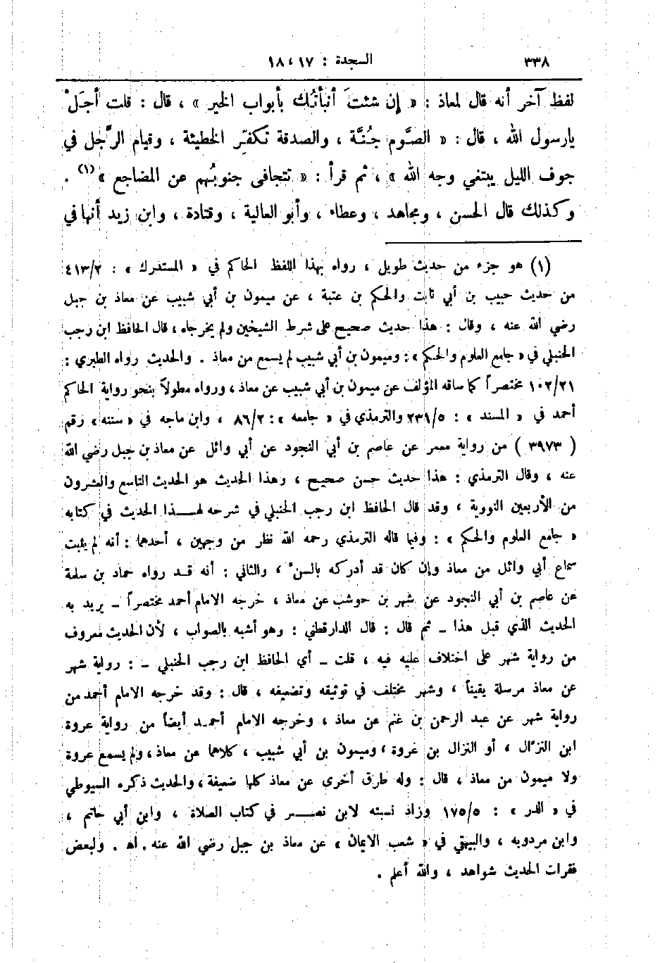 لفظ آخر أنه قال لمعاذ إن شئت أنبأتك بأبواب الخير قال قلت أجل يا رسول الله قال الصوم جنة والصدقة تكفر الخطيئة وقيام الرجل في جوف الليل يبتغي وجه الله ثم قرأ تتجافى جنوبهم عن المضاجع وكذلك قال الحسن ومجاهد وعطاء وأبو العالية وقتادة وابن زيد أنها في