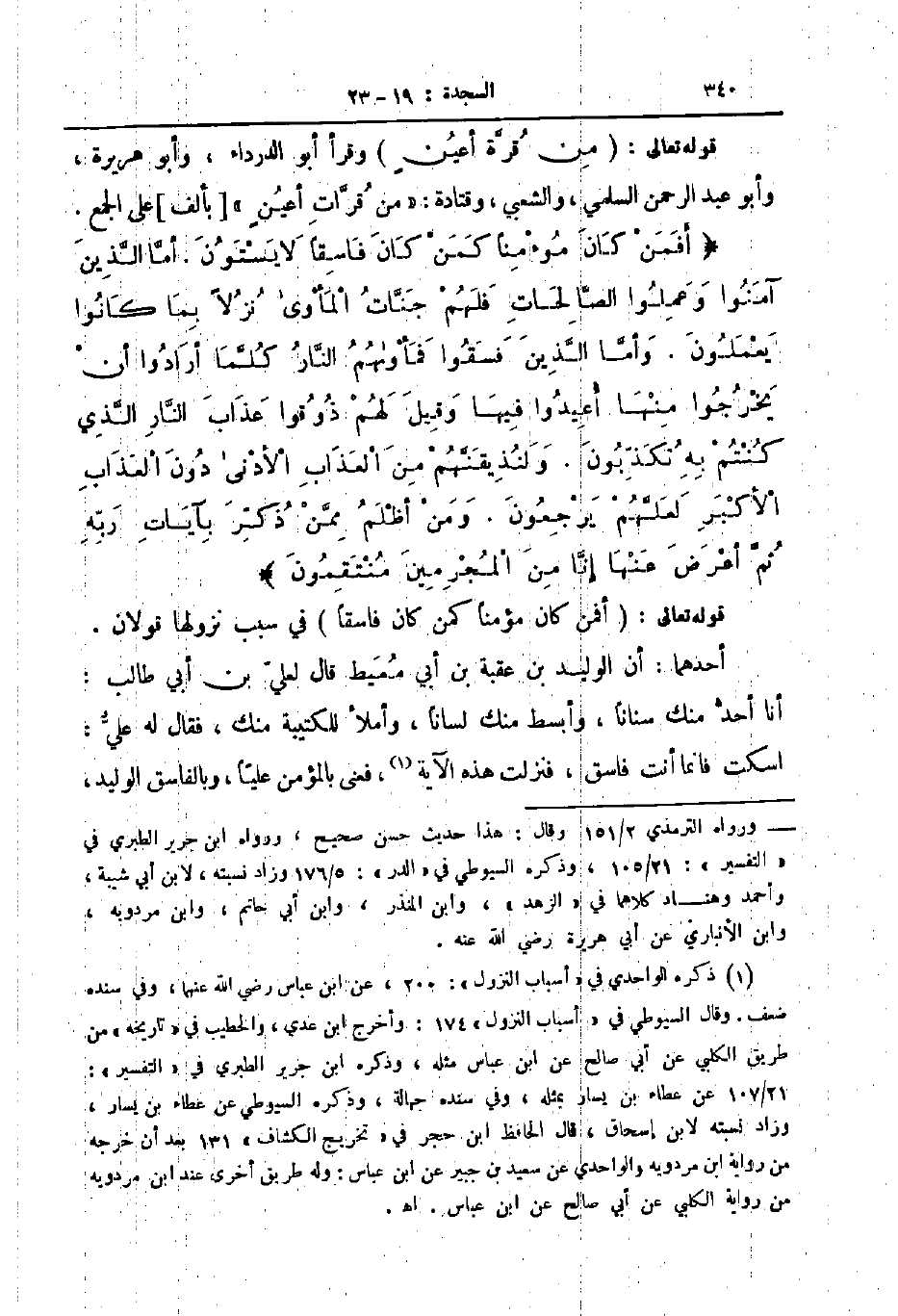 قوله تعالى من قرة اعين وقرا أبو الدرداء وأبو هريرة وأبو عبد الرحمن السلمي والشعبي وقتادة من قرات اعين بألف على الجمع أفمن كان مؤمنا كمن كان فاسقا لا يستون اما الذين آمنوا وعملوا الصالحات فلهم جنات المأوى نزلا بما كانوا يعملون وأما الذين فسقوا فمأواهم النار كلما أرادوا ان يخرجوا منها أعيدوا فيها وقيل لهم ذوقوا عذاب النار الذي كنتم به تكذبون ولنذيقنهم من العذاب الأدنى دون العذاب الأكبر لعلهم يرجعون ومن أظلم ممن ذكر بآيات ربه ثم أعرض عنها إنا من المجرمين منتقمون
