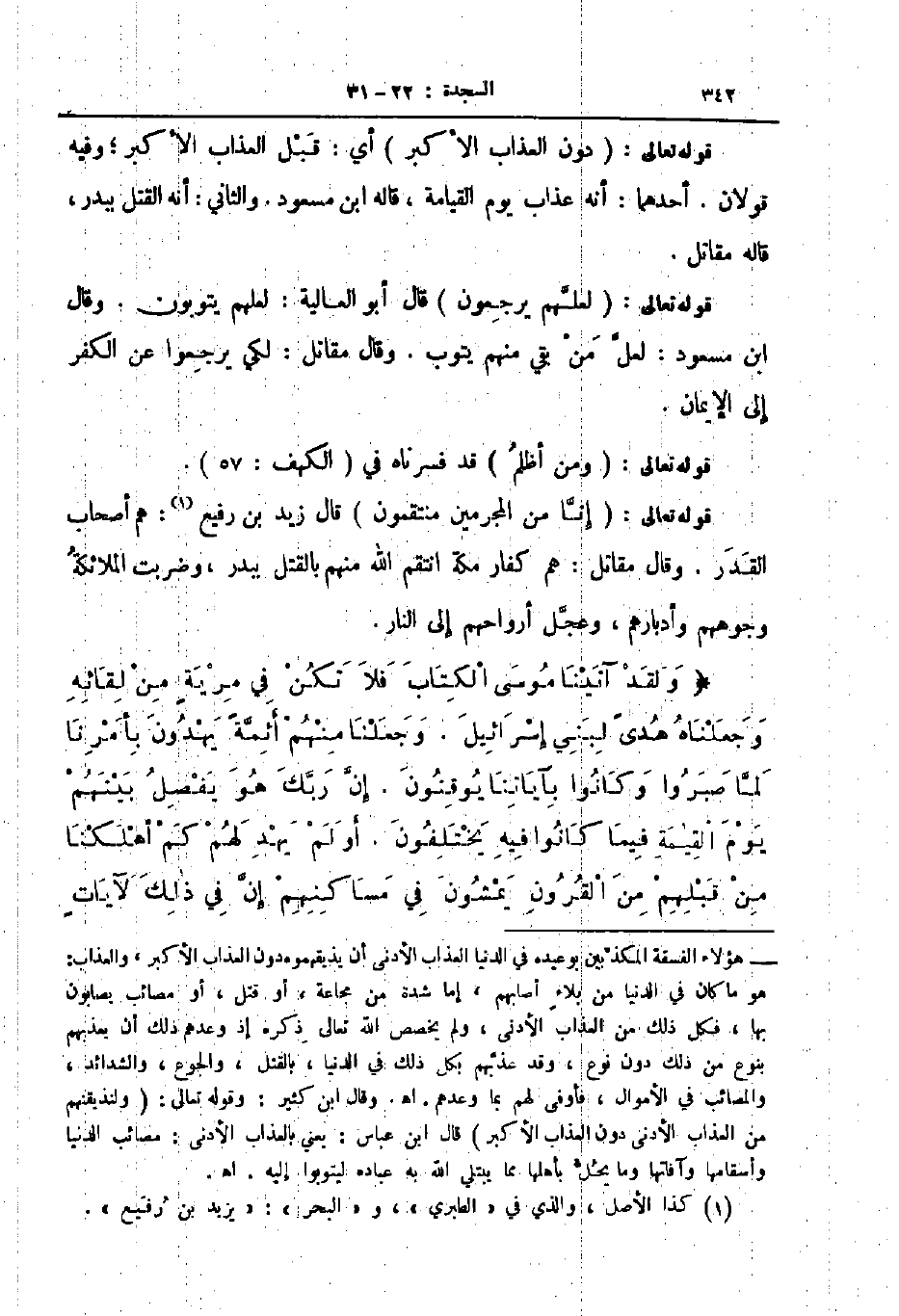 قوله تعالى إنا من المجرمين منتقمون قال زيد بن رفيع هم اصحاب القدر وقال مقاتل هم كفار مكة انتقم الله منهم بالقتل ببدر وضربت الملائكة وجوههم وأدبارهم وعجل أرواحهم إلى النار ولقد آتينا موسى الكتاب فلا تكن في مرية من لقائه وجعلناه هدى لبني إسرائيل وجعلنا منهم أئمة يهدون بأمرنا لما صبروا وكانوا بآياتنا يوقنون إن ربك هو يفصل بينهم يوم القيامة فيما كانوا فيه يختلفون أو لم يهد لهم كم أهلكنا من قبلهم من القرون يمشون في مساكنهم إن في ذلك لآيات
