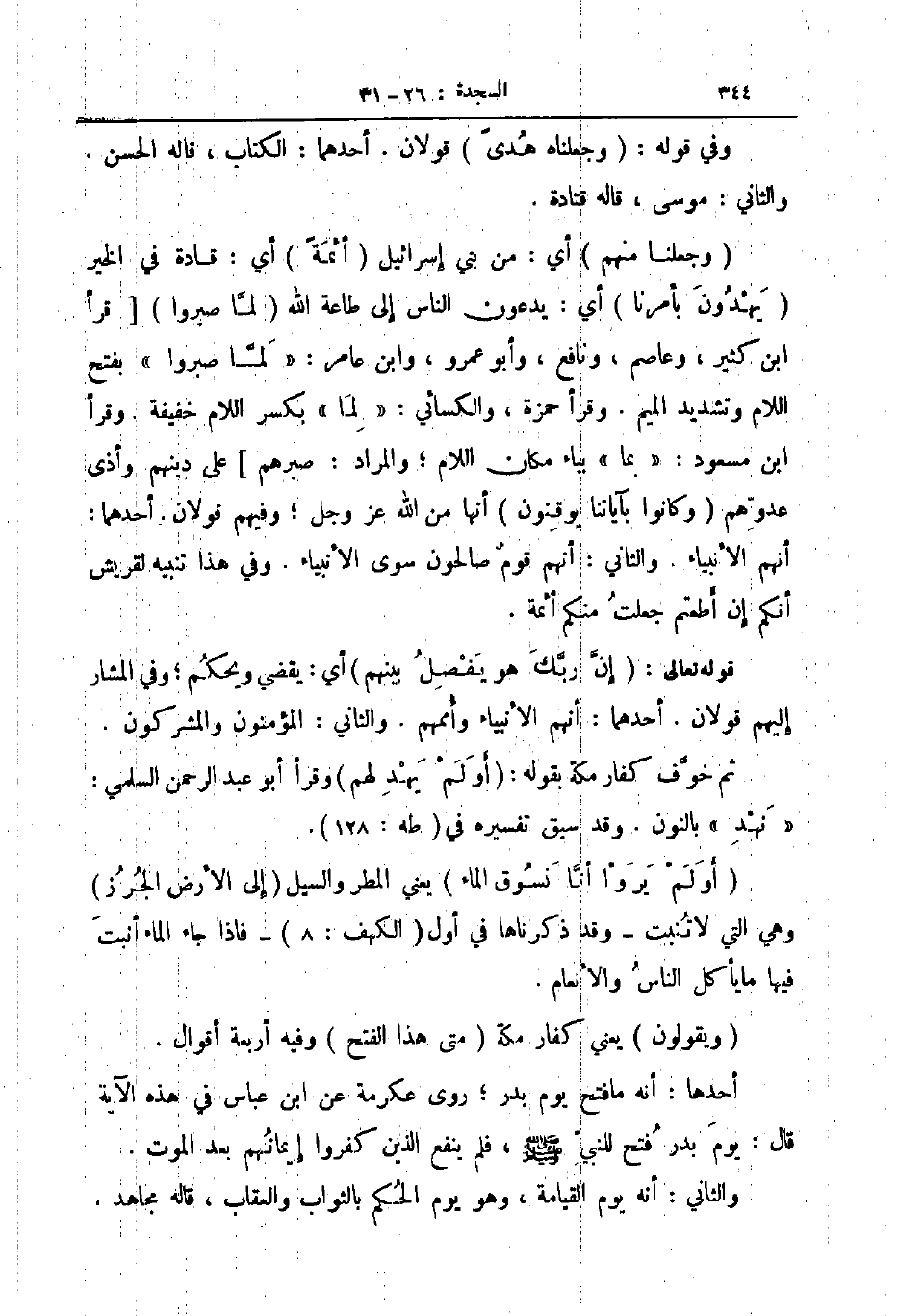وجعلنا منهم أي من بني إسرائيل أئمة أي قادة في الخير يهدون بأمرنا أي يدعون الناس إلى طاعة الله لما صبروا قرأ ابن كثير وعاصم ونافع وأبو عمرو وابن عامر لما صبروا بفتح اللام وتشديد الميم وقرأ حمزة والكسائي لما بكسر اللام خفيفة وقرا ابن مسعود بما بباء مكان اللام والمراد صبرهم على دينهم وأذى عدوهم وكانوا بآياتنا يوقنون أنها من الله عز و جل وفيهم قولان أحدهما أنهم الأنبياء والثاني أنهم قوم صالحون سوى الأنبياء وفي هذا تنبيه لقريش انكم إن أطعتم جعلت منكم أئمة
