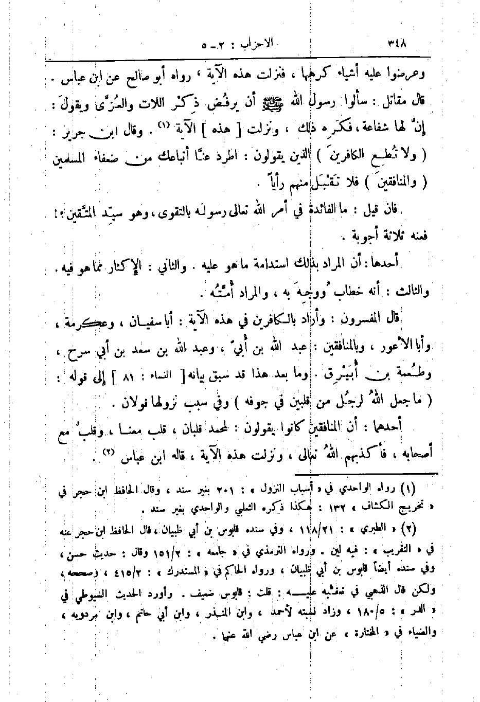 قال الفسرون وأراد بالكافرين في هذه الآية أبا سفيان وعكرمة وأبا الأعور وبالمنافقين عبد الله بن أبي وعبد الله بن سعد بن ابي سرح وطعمة بن أبيرق وما بعد هذا قد سبق بيانه النساء إلى قوله ما جعل الله لرجل من قلبين في جوفه وفي سبب نزولها قولان