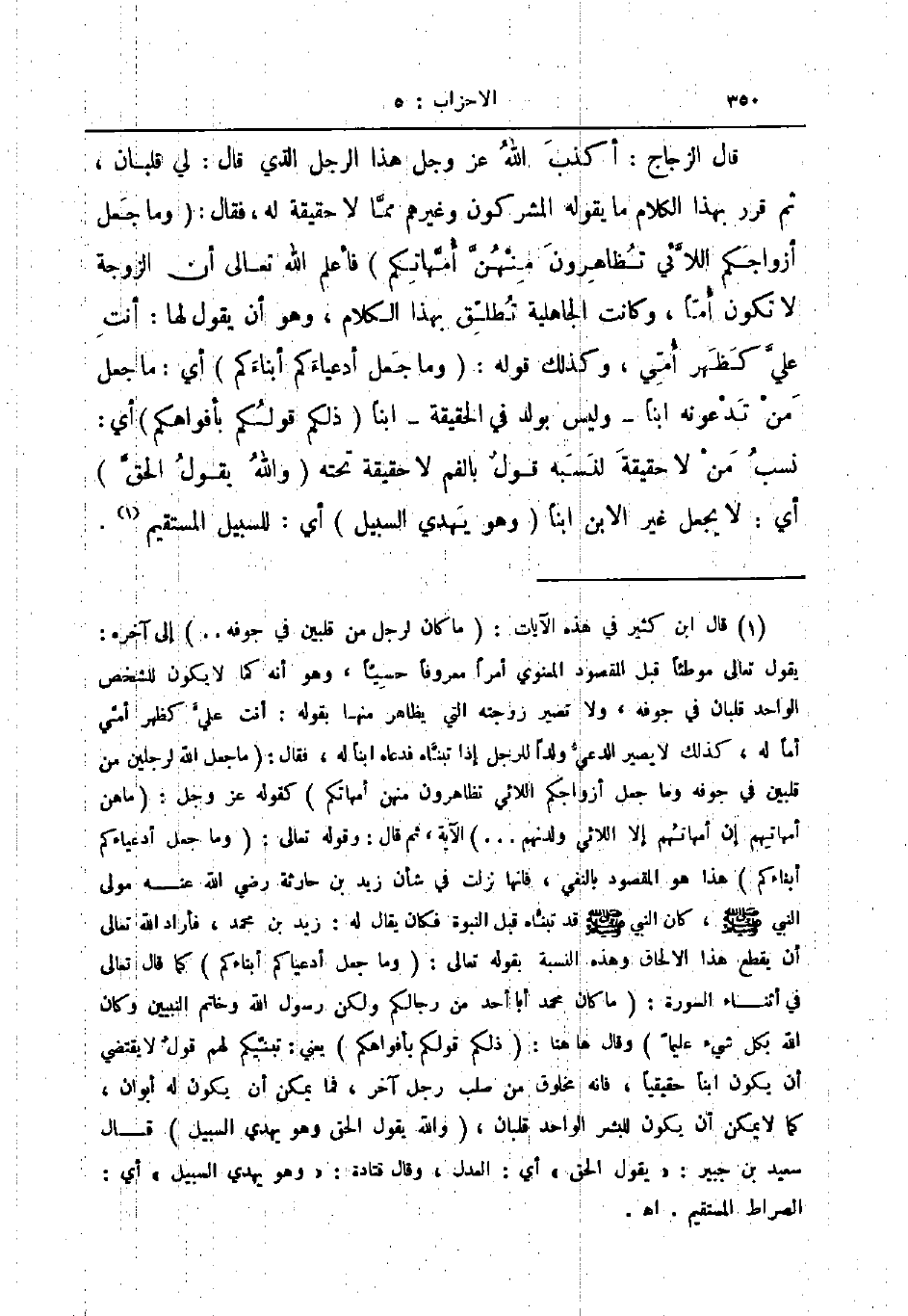 قال الزجاج أكذب الله عز و جل هذا الرجل الذي قال لي قلبان ثم قرر بهذا الكلام ما يقوله المشركون وغيرهم مما لا حقيقة له فقال وما جعل أزواجكم اللائي تظاهرون منهن أمهاتكم فأعلم الله تعالى ان الزوجة لا تكون اما وكانت الجاهلية تطلق بهذا الكلام وهو أن يقول لها انت علي كظهر أمي وكذلك قوله وما جعل أدعياءكم أبناءكم أي ما جعل من تدعونه ابنا وليس بولد في الحقيقة ابنا ذلكم قولكم بأفواهكم أي نسب من لا حقيقة لنسبة قول بالفم لا حقيقة تحته والله يقول الحق أي لا يجعل غير الابن ابنا وهو يهدي السبيل أي للسبيل المستقيم