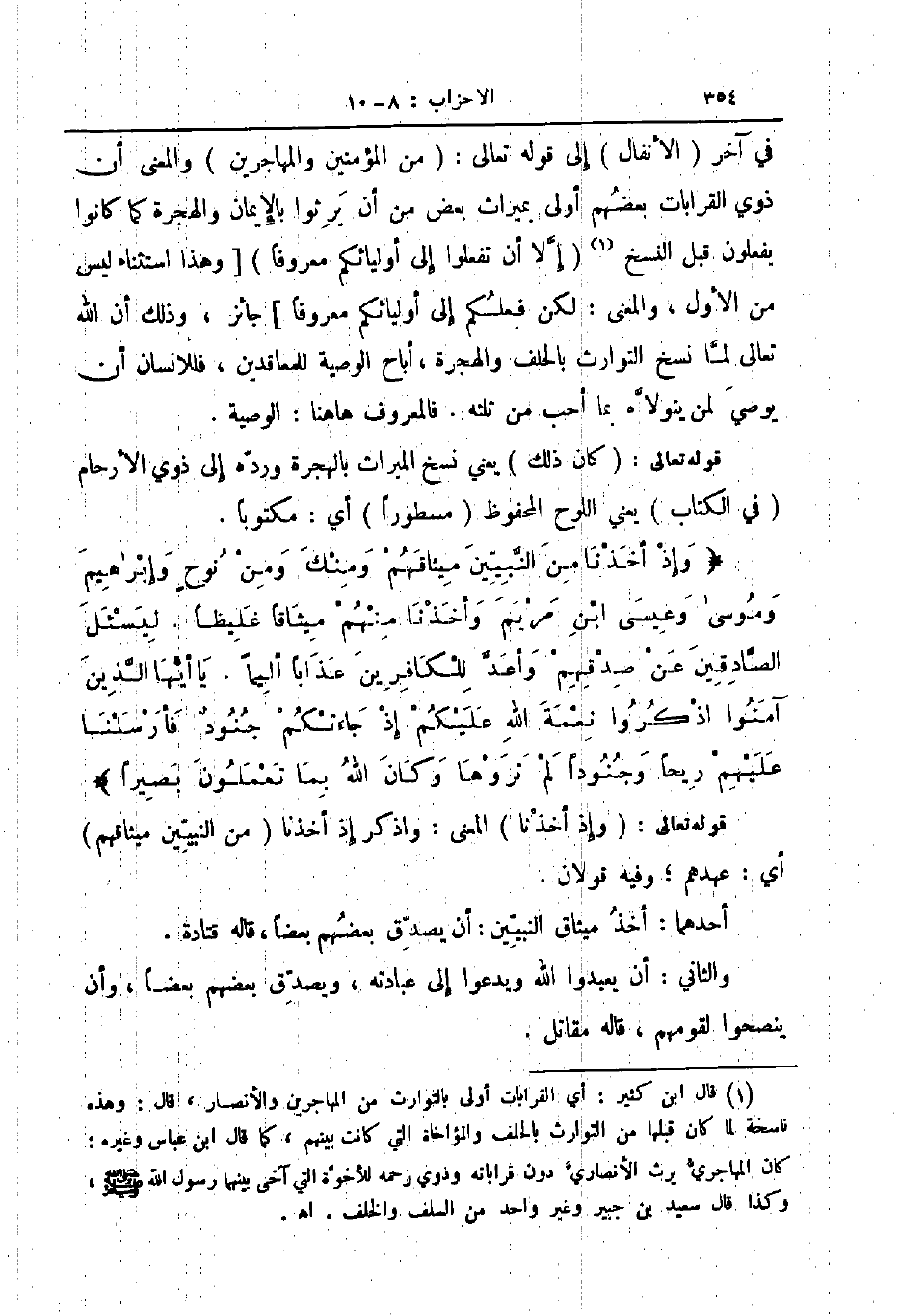 قوله تعالى كان ذلك يعني نسخ الميراث بالهجرة ورده إلى ذوي الأرحام في الكتاب يعني اللوح المحفوظ مسطورا أي مكتوبا وإذ أخذنا من النبيين ميثاقهم ومنك ومن نوح وإبراهيم وموسى وعيسى ابن مريم وأخذنا منهم ميثاقا غليظا ليسئل الصادقين عن صدقهم وأعد للكافرين عذابا أليما يا أيها الذين آمنوا اذكروا نعمة الله عليكم إذ جاءتكم جنود فأرسلنا عليهم ريحا وجنودا لم تروها وكان الله بما تعملون بصيرا