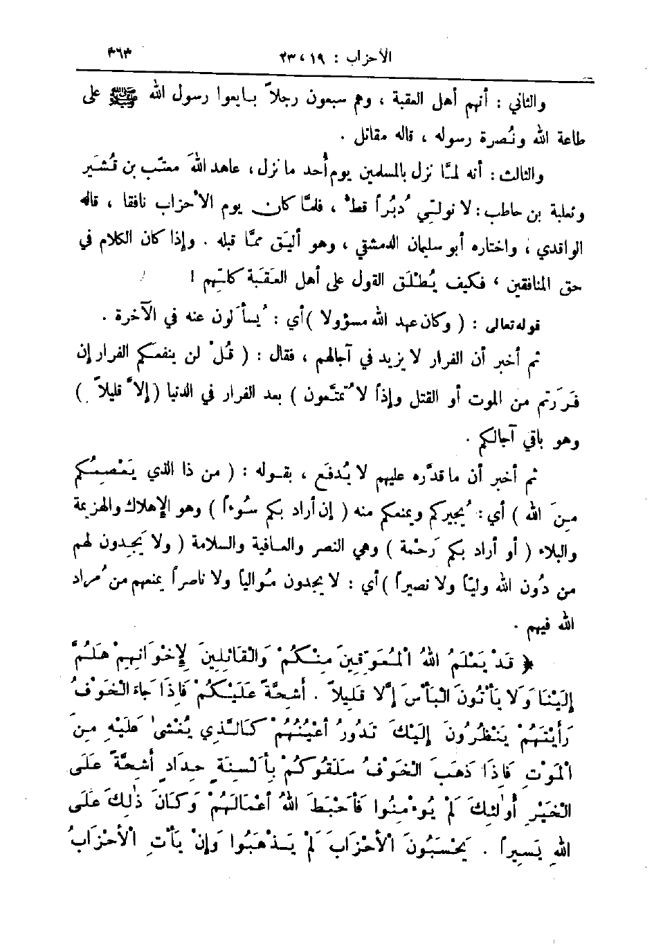قد يعلم الله المعوقين منكم والقائلين لإخوانهم هلم إلينا ولا يأتون البأس إلا قليلا أشحة عليكم فاذا جاء الخوف رأيتهم ينظرون إليك تدور اعينهم كالذي يغشى عليه من الموت فاذا ذهب الخوف سلقوكم بألسنة حداد أشحة على الخير اولئك لم يؤمنوا فأحبط الله اعمالهم وكان ذلك على الله يسيرا يحسبون الأحزاب لم يذهبوا وإن يأت الأحزاب