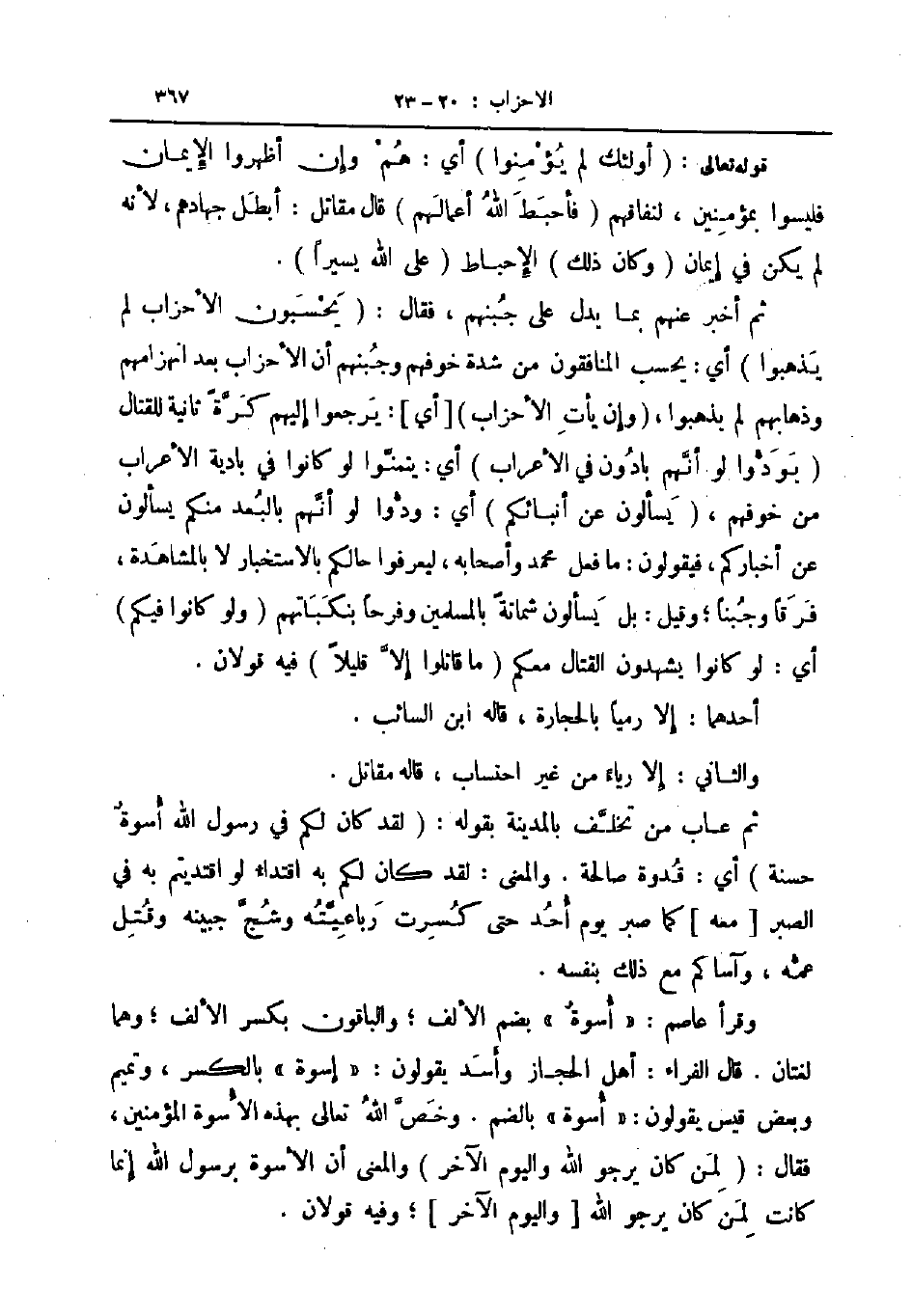 وقرأ عاصم أسوة بضم الألف والباقون بكسر الألف وهما لغتان قال الفراء أهل الحجاز وأسد يقولون إسوة بالكسر وتميم وبعض قيس يقولون أسوة بالضم وخص الله تعالى بهذه الأسوة المؤمنين فقال لمن كان يرجو الله واليوم الآخر والمعنى أن الأسوة برسول الله إنما كانت لمن كان يرجو الله واليوم الآخر وفيه قولان