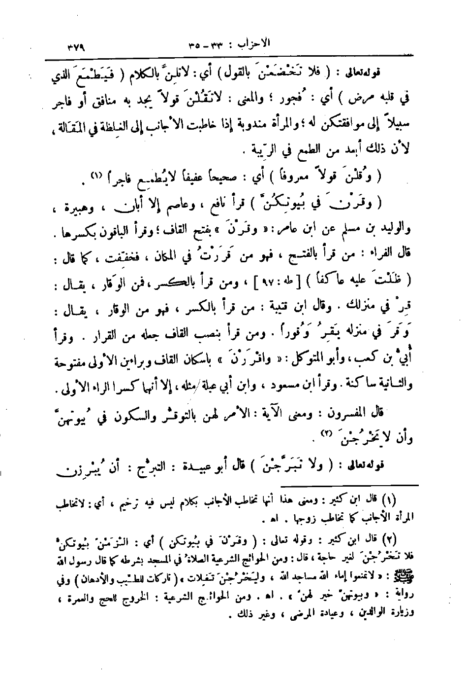 قال المفسرون ومعنى الآية الأمر لهن بالتوقر والسكون في بيوتهن وان لا يخرجن