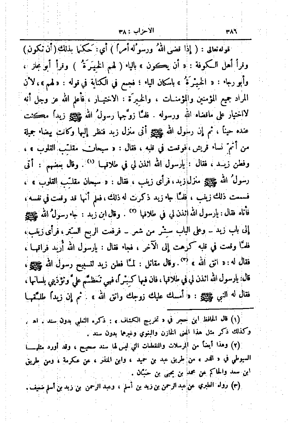 قوله تعالى إذا قضى الله ورسوله أمرا أي حكما بذلك أن تكون وقرأ أهل الكوفة أن يكون بالياء لهم الخيرة وقرأ أبو مجلز وأبو رجاء الخيرة باسكان الياء فجمع في الكناية في قوله لهم لان المراد جميع المؤمنين والمؤمنات والخيرة الاختيار فأعلم الله عز و جل أنه لا اختيار على ما قضاه الله ورسوله فلما زوجها رسول الله صلى الله عليه و سلم زيدا مكثت عنده حينا ثم إن رسول الله صلى الله عليه و سلم أتى منزل زيد فنظر إليها وكانت بيضاء جميلة من أتم نساء قريش فوقعت في قلبه فقال سبحان مقلب القلوب وفطن زيد فقال يا رسول الله ائذن لي في طلاقها وقال بعضهم أتى رسول الله صلى الله عليه و سلم منزل زيد فرأى زينب فقال سبحان مقلب القلوب فسمعت ذلك زينب فلما جاء زيد ذكرت له ذلك فعلم أنها قد وقعت في نفسه فأتاه فقال يا رسول الله ائذن لي في طلاقها وقال ابن زيد جاء رسول الله صلى الله عليه و سلم إلى باب زيد وعلى الباب ستر من شعر فرفعت الريح الستر فرأى زينب فلما وقعت في قلبه كرهت إلى الآخر فجاء فقال يا رسول الله أريد فراقها فقال له اتق الله وقال مقاتل لما فطن زيد لتسبيح رسول الله صلى الله عليه و سلم قال يا رسول الله ائذن لي في طلاقها فان فيها كبرا فهي تعظم علي وتؤذيني بلسانها فقال له النبي صلى الله عليه و سلم أمسك عليك زوجك واتق الله ثم إن زيدا طلقها