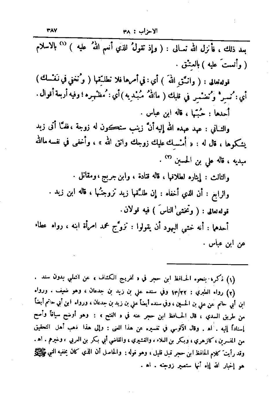 والثاني عهد عهده الله إليه أن زينب ستكون له زوجة فلما أتى زيد يشكوها قال له أمسك عليك زوجك واتق الله وأخفى في نفسه ما الله مبديه قاله علي بن الحسين