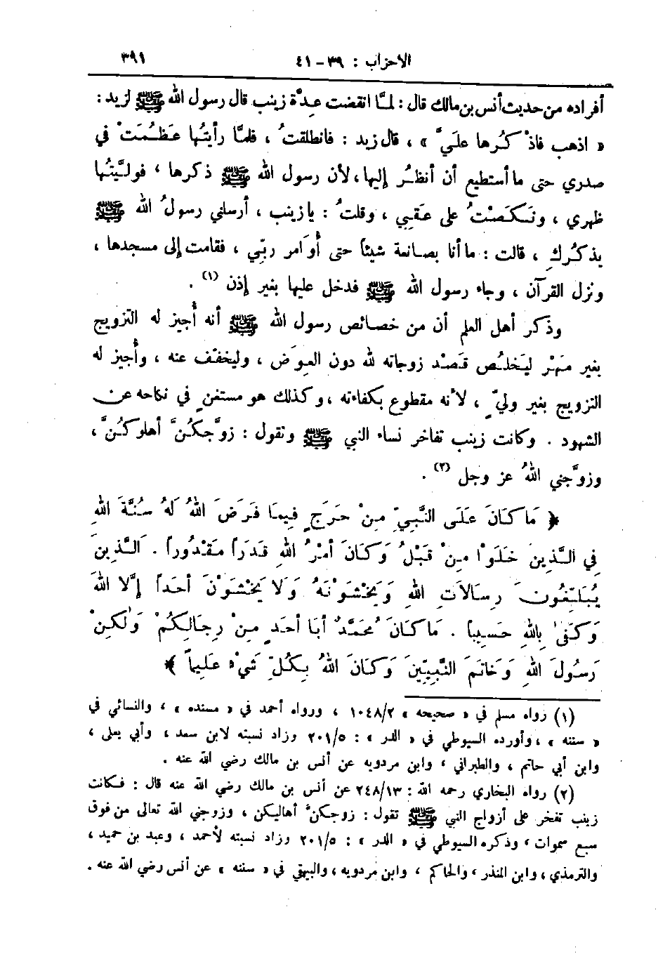 أفراده من حديث أنس بن مالك قال لما انقضت عدة زينب قال رسول الله صلى الله عليه و سلم لزيد اذهب فاذكرها علي قال زيد فانطلقت فلما رأيتها عظمت في صدري حتى ما أستطيع أن أنظر إليها لأن رسول الله صلى الله عليه و سلم ذكرها فوليتها ظهري ونكصت على عقبي وقلت يا زينب أرسلني رسول الله صلى الله عليه و سلم يذكرك قالت ما أنا بصانعة شيئا حتى أوامر ربي فقامت إلى مسجدها ونزل القرآن وجاء رسول الله صلى الله عليه و سلم فدخل عليها بغير إذن