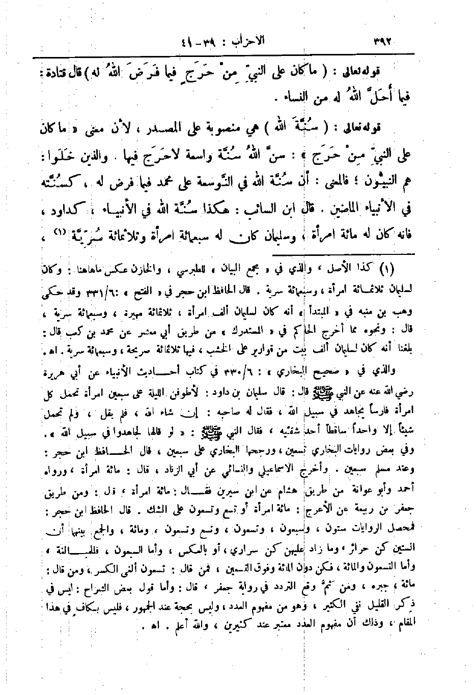 قوله تعالى سنة الله هي منصوبة على المصدر لأن معنى ما كان على النبي من حرج سن الله سنة واسعة لا حرج فيها والذين خلوا هم النبيون فالمعنى أن سنة الله في التوسعة على محمد فيما فرض له كسنته في الأنبياء الماضين قال ابن السائب هكذا سنة الله في الأنبياء كداود فانه كان له مائة امرأة وسليمان كان له سبعمائة امرأة وثلاثمائة سرية