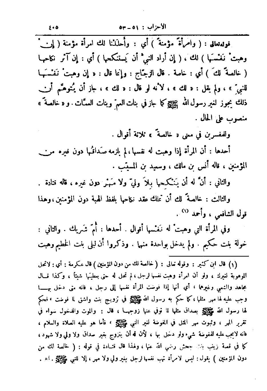 قوله تعالى وامرأة مؤمنة أي وأحللنا لك امرأة مؤمنة إن وهبت نفسها لك إن اراد النبي أن يستنكحها أي إن آثر نكاحها خالصة لك أي خاصة قال الزجاج وإنما قال إن وهبت نفسها للنبي ولم يقل لك لأنه لو قال لك جاز أن يتوهم أن ذلك يجوز لغير رسول الله صلى الله عليه و سلم كما جاز في بنات العم وبنات العمات وخالصة منصوب على الحال